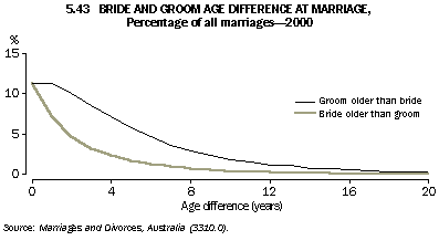 Marriages Marriage rates for the unmarried population (per 1,000 not currently married men or women aged 15 years and over) have also fallen over time.This long-term downward trend has been evident since these rates first became available in 1976. The marriage rate for men was 63 per 1,000 in 1976 while the rate for women was 61 per 1,000. In 2000 these rates fell to 34 and 32, respectively. Recent trends show that Australians are marrying later. The median ages of brides and bridegrooms at first marriage have increased from 21.1 and 23.4 years respectively in 1971 to 26.7 and 28.5 years in 2000 (graph 5.42). Part of this increase can be attributed to the increasing incidence of de facto marriages. Another factor is that young people are staying in education longer. In 2000, 65% of marriages had a groom older than the bride, and 23% of brides were older than grooms. However, there was a strong tendency for couples to be about the same age, with 44% of couples being within two years of each other, and only 8% being more than 10 years apart in age (graph 5.43). Table 5.44 brings together summary measures of marriages for Census years between 1901 and 1986, and individual years between 1990 and 2000.
