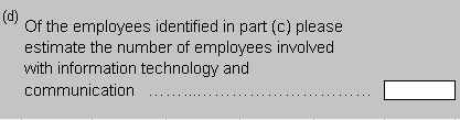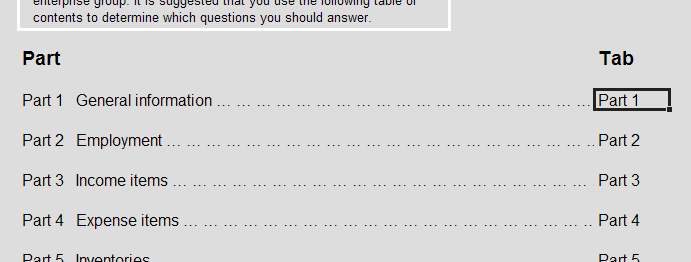 General Construction and Layout There should be an additional "E" at the end of all form IDs on the front of form to clearly indicate, in the Forms Repository view, that it is the Excel version of the paper form. If an "E" is already used in the form name, then use an "X" at the end. Layout of Excel form content is based directly on the paper form. This includes all instructions and notes except any paper-specific ones. For example, "Tick all that apply" should be replaced with "Please indicate with an 'X'..." and references to reply paid envelopes should be removed. The text of notes, definitions and instructions should align under the first letter of text, not under the dotpoint. However, this preferred formatting should only be done where practical, and where time permits. The bottom edge of response boxes should align with the text, or with the last line of text for questions with more than one line of text. In order to achieve this, you may have to use merged cells for the question text. For example: Diagram 3.1 It is possible to merge a number of cells across rows and columns in order have enough space to fit the question without the need to increase row heights. Using tall row heights for questions makes it impossible to align response boxes with the question text, so this practice should be avoided where possible. Response boxes should be correctly aligned because it makes it easier for the respondent to identify the correct place of response. Diagram 3.2 shows an example of the use of merged cells with and without formatting. The merged cells are identified by the lack of grid lines: Diagram 3.2 Forms are designed at a screen resolution of 800x600 to accommodate the lowest resolution in widespread use, and, allowing for the white space at the bottom of worksheets, so that they print off to closely resemble their paper equivalents. BSCs have the option to include comments boxes at the end of each part (worksheet) to enable the respondent to document any problems or concerns at the time they occur. This is currently a feature of the Local Government Finance (LGF) Excel form. For example: Diagram 3.3 If comment boxes are used, then the BSC's business process and IT systems may be affected, and the BSC should be made aware of this so that they can plan to identify and deal with the extra information being collected. Macros There are two types of Macros used for Excel forms, the first are form formatting macros used by the form developers to construct the form, protect it etc. These should not be stored in the form. The second type of Macro is meant for use by the respondent, and is stored within the form workbook. Note that Excel forms should not include macros unless there is a specific need that can only be achieved by using a macro. Such a macro is "Add Rows" in the IFAB Form 90 Excel workbook. These macros are developed by TA for ESG. Such macros should undergo extensive testing with providers and ABS processes (Secure Deposit Box). Note: care is required as some macros will not pass through our security systems and/or the provider's security. Macros for use by the respondent and represented by a button in the worksheet should be positioned intuitively. For example "Add Row" should be positioned at the end of the last row and column, where the respondent would already be looking when the need for additional rows arises. Buttons should not appear at the top of columns where they can be confused with column headings. Diagram 3.4 shows an example of where a button should be placed in relation to the relevant response box: Diagram 3.4 Worksheets and Sections All Excel forms are divided into worksheets of varying length that represent the sections or parts of the paper form. The main use and features of the worksheets will be described below. Excel forms may use more parts and sections than the paper form equivalents to aid navigation and for convenience in assembling the form. It can be easier to have standard parts (Please read first, How to use this form, How to submit, Time taken) separate, so that they can be inserted as a sheet into new forms. All forms should start with a standard 'How to use this form' worksheet about navigation and saving, followed by the 'Front of Form' and 'Please read this first' worksheets. For long forms, a 'Content' worksheet should be included after the 'Please read this first' sheet. This describes where to find the relevant sections, for example: Diagram 3.5 Each Part or Section has an Excel 'tab' at the bottom of the screen that can be used to navigate between worksheets. Tabs should be labelled with the part headings, not the part numbers (or letters). The exception to this rule is for a survey with a large number of worksheets, such as the Survey of International Investment (SII), where it is not practical to use the full part heading for every worksheet tab. The following example shows how the tabs should be labelled: Diagram 3.6 This example shows how tabs are labelled when there are a large number of worksheets: Diagram 3.7 If there are simply too many sheets to avoid some of them scrolling out of view horizontally, an additional instruction should be included in the 'How to use ..' section: Diagram 3.8 Inside a given section/part/worksheet the content is displayed in one scrolling 'page', though in some cases this results in only a portion of the screen being used. Subsequently, references to paper form page numbers are removed and inter-page gaps and spacing adjusted to give an even, continuous, display. Each worksheet ends with a note to the effect that it is the end of that worksheet. 'End of part' notifications should be placed in the bottom right hand corner of the 'page'. The natural navigation of the eye will make this area of the worksheet the last part viewed by the respondent. By putting the 'End of part' notification there, respondent eye movement is reduced. The 'End of part' notifications should also be meaningful by describing w