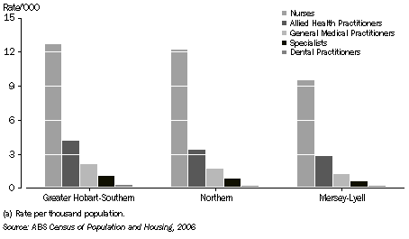 SELECTED HEALTH OCCUPATIONS The 2006 Census of Population and Housing revealed there were 5,628 nurses in Tasmania, with 90.1% of them being female. The Greater Hobart and Southern Statistical Divisions (SDs) had 53.0% of the state's nursing population, while Northern SD had 29.0%, and Mersey-Lyell SD had 18.0%. To relate this to the distribution of the State's population, there were 12.7 nurses per thousand people in the Greater Hobart and Southern SDs, 12.2 in the Northern SD and 9.5 in Mersey-Lyell SD. There were 845 general medical practitioners (GPs) in Tasmania. Some 57.5% of GPs in the state were located in the Greater Hobart and Southern SDs, while a further 27.2% of GPs were located in Northern SD, and 15.3% of GPs were located in Mersey-Lyell SD. This equated to a rate of 2.1 GPs per thousand people in the Greater Hobart and Southern SDs, 1.7 in the Northern SD and 1.2 in Mersey-Lyell. Dental practitioners totalled 134 in Tasmania, with 59.7% located in the Greater Hobart and Southern SDs, 23.9% located in Northern SD, and a further 16.4% located in Mersey-Lyell SD. The rate per thousand was 0.3 in Greater Hobart and Southern SDs, 0.2 in the Northern SD and 0.2 in Mersey-Lyell.