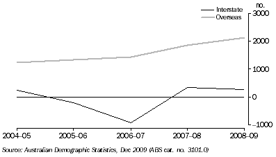NET MIGRATION Over the year to June 2009, Tasmania's interstate migration was composed of an estimated 13,218 people taking up Tasmanian residency and 12,546 Tasmanian residents moving to other parts of Australia. This created a net gain of 672 people to Tasmania. In the year to June 2009, Tasmania had a net increase of 2,144 overseas migrants, up from the estimate of 1,871 during the year to June 2008.
