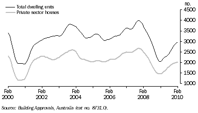 In February 2010, the total value of building approvals in trend terms was $1,245 million, a 0.6% increase from the previous month and a 9.8% increase from February 2009. Residential buildings accounted for 66% of the total value of buildings. For more information on this topic, please refer to Building Approvals, Australia (cat. no. 8731.0) or contact the National Information and Referral Service on 1300 135 070. This publication is released monthly. BUILDING ACTIVITY In the September 2009 quarter, the total number of dwelling units completed in trend terms in Queensland was 8,150. This was a decrease of 4.5% from the June 2009 quarter. There were 5,468 new houses completed during the September 2009 quarter which represents 67% of the total number of dwelling units completed. In the September 2009 quarter, the trend estimate of the value of total building work done was $4,081 million. This was a decrease of 16% from the September 2008 quarter. For more information on this topic, please refer to Building Activity, Australia (cat. no. 8752.0) or contact the National Information and Referral Service on 1300 135 070. This publication is released quarterly. ENGINEERING CONSTRUCTION Between the September 2009 and December 2009 quarters, the Queensland chain volume trend estimate of the value of engineering construction decreased by 1.4% to $5,209 million. This follows the period of strong growth since September 2003 quarter. For further information on this topic, access Engineering Construction Activity, Australia (cat. no. 8762.0) or contact the National Information and Referral Service on 1300 135 070. This publication is released quarterly. Document Selection These documents will be presented in a new window.