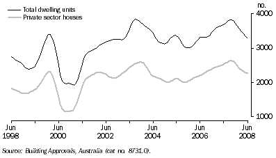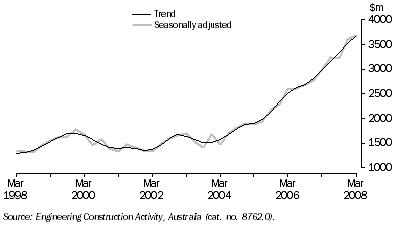 Building approvals Building activity Engineering construction BUILDING APPROVALS In June 2008, the total number of dwelling units approved in Queensland in trend terms was 3,276. The trend estimate for the total number of dwelling units approved for June 2008 showed total approvals decreased by -2.1% from the previous month, the eighth consecutive monthly decrease after a consistent upward trend of almost two years. The trend estimate for private sector houses was 2,269 approvals which represents 69% of total dwelling units approved. In June 2008, the total value of building approvals in trend terms was $1,638.2 million, a slight (-0.6%) decrease from the previous month and a 6.7% increase from June 2007. Residential buildings accounted for 58% of the total value of buildings. For more information on this topic, please refer to Building Approvals, Australia (cat. no. 8731.0) or ring the National Information and Referral Service on 1300 135 070. This publication is released monthly. BUILDING ACTIVITY In the March 2008 quarter, the total number of dwellings completed in trend terms in Queensland was 10,347. This is an increase of 2.6% from the December 2007 quarter. There were 6,737 new houses completed during the March 2008 quarter which represents 65% of the total number of dwelling units completed. In the March 2008 quarter, the trend estimate of the value of total building work done was $4,094.6 million, a -1.3% decrease from March 2007 quarter. For more information on this topic, please refer to Building Activity, Australia (cat. no. 8752.0) or ring the National Information and Referral Service on 1300 135 070. This publication is released quarterly. ENGINEERING CONSTRUCTION Between the December 2007 and March 2008 quarters, the Queensland chain volume trend estimate of the value of engineering construction increased by 4.2% to $3,672.6 million. This continues the period of strong growth since December 2003 quarter. For further information on this topic, access Engineering Construction Activity, Australia (cat. no. 8762.0) or ring the National Information and Referral Service on 1300 135 070. This publication is released quarterly. Document Selection These documents will be presented in a new window.