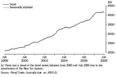 Retail trade New motor vehicle sales Private new capital expenditure RETAIL TRADE The June 2008 trend estimate for Queensland's retail turnover was $4,176.9 million, a 3.3% increase since June 2007. Food retailing accounted for 41% of total retail turnover in June 2008 and Hospitality and service industries turnover contributed 17%. In the twelve months to June 2008, the industry groups with the largest percentage increases in retail turnover (trend) were Recreational goods rising 29% to $180.6 million and Other retailing which increased 16% to $409.3 million. The largest decreases in total turnover were experienced in Clothing and soft good retailing (-19% to $201.4 million) and Hospitality and service industries (-5.8% to $719.8 million). Retail Turnover By Industry Group, Queensland, Trend - Percentage change over twelve months to June 2008 Further information about this topic can be accessed at Retail Trade, Australia (cat. no. 8501.0) or ring the National Information and Referral Service on 1300 135 070. This publication is released monthly. NEW MOTOR VEHICLE SALES In trend terms, 9,714 new passenger vehicles and 18,785 vehicles in total were sold in June 2008 in Queensland. Corresponding sales for Australia were 52,014 and 88,460. When comparing June 2008 with May 2008, Queensland recorded a decrease in total vehicle sales of -1.0%. In June 1998, new passenger vehicle sales accounted for 67% of total new vehicle sales in Queensland. By June 2008, the proportion of new passenger vehicle sales had fallen to 52%. Further information about new motor vehicle sales can be accessed from Sales of New Motor Vehicles, Australia (cat no. 9314.0) or ring the National Information and Referral Service on 1300 135 070. This publication is released monthly. PRIVATE NEW CAPITAL EXPENDITURE Between the December 2007 and the March 2008 quarters, the Queensland chain volume trend estimate of private new capital expenditure increased marginally by 2.8% to $4,273 million. During the same period, expenditure on Equipment, plant and machinery increased by 2.1% to $2,770 million while expenditure on Buildings and structures increased by 3.9% to $1,503 million. Comparing the March 2008 quarter with the March 2007 quarter, Queensland's total private new capital expenditure increased by 11%. Expenditure on Equipment, plant and machinery grew by 8.9% and expenditure on Buildings and structures increased by 14%. Further information on this topic can be accessed at Private New Capital Expenditure and Expected Expenditure, Australia (cat. no. 5625.0) or ring the National Information and Referral Service on 1300 135 070. This publication is released quarterly. Document Selection These documents will be presented in a new window.