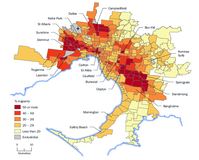 Source: ABS 2011 Census of Population and Housing Vietnam, Cambodia and the PhilippinesCountries in eastern Asia including Vietnam (69,000 migrants) and the Philippines (61,000 migrants) also contributed significantly to the overseas-born population of Sydney in 2011. For migrants born in Vietnam, suburbs in the city's south west were most favoured, particularly Cabramatta (35%), Canley Vale (29%), Cabramatta West (28%) and Canley Heights (28%). These same suburbs also tended to be favoured by Cambodian-born migrants. Although smaller in population terms (11,000 migrants), around a third of all Cambodian-born migrants in Sydney lived in one of these suburbs in 2011. By contrast, migrants born in the Philippines tended to be most densely concentrated in suburbs in Sydney’s outer west. These included Woodcroft, where around a quarter (24%) of the population were Filipino-born, as well as Plumpton (19%) and Rooty Hill (18%). In fact, nine of the ten Sydney suburbs with the largest proportion of people born in the Philippines in 2011 were situated in the immediate area between Blacktown and Penrith. Other nations While other countries of birth contribute smaller numbers of people to the overall population of Sydney, the settlement patterns of some of these groups are also strongly localised. Lebanese-born migrants in Australia are very likely to have settled in Sydney with seven out of every ten living there in 2011. The suburbs where Lebanese migrants made up the largest proportion of the population were situated in the Bankstown area including Mount Lewis (18%), Punchbowl (16%), and Greenacre (15%). Suburbs north-west of these, such as South Granville (15%), Old Guildford (14%) and Guildford (13%), also had relatively large Lebanese-born populations. Korean-born migrants were also a large population group in Sydney. Suburbs where Korean-born migrants made up the largest proportion of the population were in the area around Olympic Park, including Rhodes (13%), Newington (12%) and Liberty Grove (11%). Meadowbank (11%) on the other side of the Parramatta river also had a comparatively large Korean-born population. Migrants born in Italy, on the other hand, tended to be concentrated in suburbs to the city’s inner west including Haberfield (15%), Wareemba (14%), and Five Dock (10%). Italian-born migrants were also found in suburbs to Sydney's outer south-west including Austral (13%) and Horsley Park (10%). For migrants born in South Africa, suburbs in the upper north shore including St Ives and St Ives Chase (both 12%) were favoured. Eastern suburbs including Dover Heights (15%) and Rose Bay (10%) were also favoured by South African-born migrants. Iraqi-born migrants were strongly concentrated in suburbs around Fairfield. In 2011, nearly one in four residents of Fairfield Heights (24%) and Fairfield (23%) was born in Iraq. Greenfield Park (16%) nearby also had a relatively large population of Iraqi-born migrants. For migrants born in Thailand or Indonesia, inner city suburbs of Haymarket (17% and 13% respectively) and Sydney CBD (9% and 12% respectively) were popular. Further south-west, Lakemba (15%) and Wiley Park (15%) were the suburbs with the largest population of Bangladeshi-born migrants in proportional terms. Migrants born in Fiji are a large population group in Sydney and tended to be most concentrated in suburbs to the outer south west like Hoxton Park (10%) and Prestons (8%). Nepalese-born migrants - one of the fastest growing migrant groups in Australia - were most concentrated in Rockdale (8%) and Kogarah (7%). MELBOURNE Melbourne is an attractive city for migrants. With a legacy of settling Anglo-Celtic, southern European, and Asian migrants over its more than 150 year history, Melbourne promotes itself as a diverse city that provides education and employment opportunities to new arrivals.6 Migrants in Melbourne are most concentrated around three regions of the city. In the city centre, close to two-thirds of the residents of Melbourne CBD (68%), Carlton (63%), and Southbank (61%) were migrants in 2011. The close proximity of these suburbs to the University of Melbourne, RMIT University, and a range of other higher education providers makes them especially popular with international students. In 2011, a quarter of the population of Melbourne CBD and a third of the population of Carlton were international students. To the city’s south-east, Clayton (70%), Clayton South (65%), Springvale (69%), Springvale South (59%), Noble Park (60%), and Dandenong (67%) were also strongly populated with migrants. Although these suburbs are close to each other, the characteristics of migrants within them varied. In Clayton, for example, migrants tended to be younger, more recent arrivals to the country with a median age of 27 years and a median length of residence in Australia of 4 years (Clayton also has a campus of Monash University). This contrasts with neighbouring Springvale and Springvale South where the migrant population was older (median age 40 years and 42 years respectively) and more established in the community (median length of residence 15 and 19 years respectively). To the west of the city, the suburbs of St Albans (62%), Sunshine North (58%) and Braybrook (57%) also had large proportions of people born overseas. Significant countries of birth for migrants in these suburbs included Vietnam, India and Malta. The following map shows the proportion of overseas-born people in each suburb in Melbourne. PERCENTAGE OF MIGRANTS IN MELBOURNE BY SUBURB - 2011 Who are Melbourne's largest migrant groups?(a) Suburbs with fewer than 100 usual residents have been excluded from analysis. Source: ABS 2011 Census of Population and Housing MIGRANTS IN MELBOURNE BY COUNTRY OF BIRTH(a) - 2001 AND 2011 Patterns of settlement in Melbourne by country of birth Footnote(s): (a) Countries of birth with the highest numbers of residents in Melbourne. (b) Former Yugoslav Republic of Macedonia. Source(s): AB