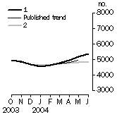 DWELLING UNITS APPROVED STATE TRENDS NEW SOUTH WALES The trend estimate for total dwelling units approved in New South Wales has risen for the last four months, with the rate of growth slowing in May 2004. The trend for private sector houses has been flat for the last four months. VICTORIA The trend estimates for total dwelling units approved in Victoria is now showing rises over the last three months, following six months of decline. The trend for private sector houses was flat in May 2004, after falling for the previous eight months. QUEENSLAND The trend estimate for total dwelling units approved in Queensland has fallen for the last eight months, following six months of growth. The trend for private sector houses has fallen for the for the last six months. SOUTH AUSTRALIA The trend estimate for total dwelling units approved in South Australia has fallen for the last eight months, with the rate of decline slowing over the last three months. The trend for private sector houses has fallen for the last eight months. WESTERN AUSTRALIA The trend estimate for total dwelling units approved in Western Australia has fallen for the last six months, following six months of growth. The trend for private sector houses rose in May 2004, following five months of decline. EFFECT OF NEW SEASONALLY ADJUSTED ESTIMATES ON TREND ESTIMATES TREND REVISIONS Recent seasonally adjusted and trend estimates are likely to be revised when original estimates for subsequent months become available. The approximate effect of possible scenarios on trend estimates are presented below. Generally, the greater the volatility of the original series, the larger the size of the revisions to trend estimates. Analysis of the building approval original series has shown that they can be revised substantially. As a result, some months can elapse before turning points in the trend series are reliably identified. The graphs and tables which follow present the effect of two possible scenarios on the previous trend estimates: that the June seasonally adjusted estimate is higher than the May estimate by 4% for the number of private sector houses approved and 13% for other dwelling units approved; and that the June seasonally adjusted estimate is lower than the May estimate by 4% for the number of private sector houses approved and 13% for other dwelling units approved. These percentages represent the average absolute monthly percentage change for these series over the last ten years.