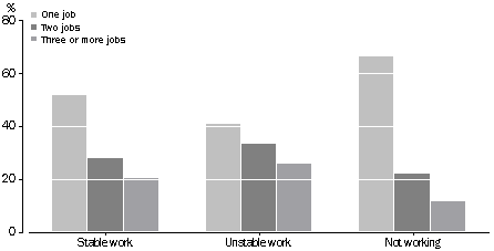 No longer working Just over a quarter of young jobseekers were not working at the end of the period but had worked during the period. The main reasons that they stated for losing their most recent job were that they were retrenched or their employer went out of business (28%), their job was temporary or seasonal (28%) and their own ill health or injury prevented them from working (19%). Approximately three quarters of this group (61,500) were looking for work at the end of the period, and the remaining quarter (19,000) were absent from the labour market. Job mobility Many of those who had worked in the period had held more than one job. Those young jobseekers who ended the period in unstable work were also the most likely to have changed jobs during the period; 26% had worked in three or more jobs and 33% in two jobs NUMBER OF JOBS HELD: LABOUR MARKET OUTCOME, SEPTEMBER 1996 Source: Unpublished data, Survey of Employment and Unemployment Patterns. Young jobseekers who had not worked There were 67,000 young jobseekers (22%) who did not work during the period from May 1995 to September 1996. Of these, 42,000 ended the period looking for work. The main difficulties in finding work that they stated at the end of the period were: no vacancies, either at all or in their line of work (24%); insufficient work experience (21%); lack of necessary education, training or skills (20%); and transport problems (14%). The remaining 25,000 young jobseekers ended the period absent from the labour market. Their most common main activities at this time were home duties/child care (45%) and study (31%). In total, 71% of this group were women, of whom 60% stated home duties/child care as their main activity while absent from the labour market. YOUNG JOBSEEKERS' CHARACTERISTICS AND PROPORTION WITH TABLE WORK OUTCOMES