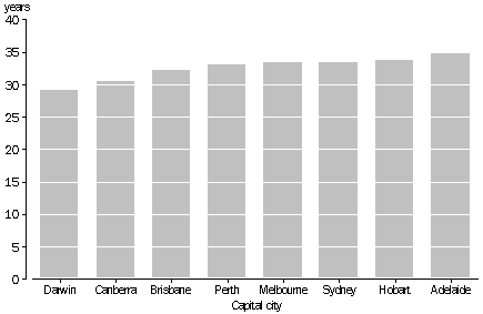 Age structure Capital cities differ slightly in the median ages of their populations. There is a dynamic relationship between the median age of a city's population and its growth due to natural increase. Younger populations are likely to produce children. This will both increase the city's total population and lower the median age. In contrast, older populations produce fewer children and have higher death rates which decrease a city's population and raise the median age. In 1994 Darwin had the youngest population with a median age of 29.4. It had the lowest proportion of people aged 65 or over (3% of the population compared to 12% of the population of all capital cities). It also had the highest proportion of people of prime working age (25-44) with 37% of its population in this group. This reflects a tendency for people to move to Darwin for work and leave on retirement. As a consequence of the numbers of working age adults in Darwin, this city also had a higher proportion of children than other cities. Canberra also had a young median age (30.4 years) compared to the other capital cities. Like Darwin, it had a low proportion of people aged 65 and over and a high proportion of people of prime working age. It also had a high proportion of people aged 15-24, a consequence of the numbers of young people who move to Canberra for study or work purposes as well as high birth rates in Canberra in the 1970s. Adelaide with a median age of 34.8 years, had the largest proportion of people aged 65 or over of any capital city. Hobart also had a relatively high proportion of older inhabitants. As the populations of Adelaide and Hobart age, natural increase will slow further and the median age will continue to rise. MEDIAN AGE OF THE POPULATION IN CAPITAL CITIES, JUNE 1994 Source: Estimated Residential Population (unpublished data) Birthplace The proportions of the population who were born overseas varies for different capital cities. In 1991, 29% of people living in capital cities had been born in an overseas country. However, between cities, this ranged from 13% in Hobart to 34% in Perth. 8% of the population of Australia's capital cities had been born in the United Kingdom (UK). This group formed the largest proportion of the overseas born population in every capital city. In Hobart, Perth and Adelaide almost half of the overseas born were from this country. 3.2% of the population in Melbourne and 2.7% of those in Adelaide had been born in Italy. On average over all capital cities, 2.1% of the population were from Italy. People born in New Zealand were also well represented in the population of capital cities. However, their proportions varied greatly between cities. In Brisbane they accounted for 3.4% of the population and in Darwin 2.7%. A large number of New Zealanders also lived in Sydney although they accounted for only 1.9% of the population in that city. BIRTHPLACES OF CAPITAL CITY POPULATIONS, 1991