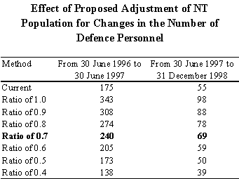 The lower intercensal discrepancy in the NT from using a 3 month lag can be attributed to high net migration Medicare figures (approximately 500 persons) to the NT in the September 1996 Quarter. In using the lagged model, these Medicare data are not referenced post 30 June 1996. Instead, this quarter is to estimate interstate migration in the June 1996 quarter and plays a significant role in decreasing the estimated intercensal discrepancy in the 1991 to 1996 intercensal period. This appears more intuitive, with the 0 month lag suggesting that people would move to the NT in the September quarter, at the end of the dry season. Thus, while Medicare address data suggest that address information is regularly updated, the data are not clear. Furthermore, it seems intuitive that an average lag of three months between moving and registering is more probable than no lag at all. As such, the decision was to proceed with using lagged Medicare data. The choice of a 3 month lag Given that the current ABS publication schedule and the fact that the ABS receives Medicare data quarterly from the HIC, only lags of 3 months or 0 months can be accommodated. The 3 month lag was chosen in preference to the 0 month lag as it was thought to be more intuitive and produced a lower intercensal discrepancy for the 1991-96 intercensal period (see previous table). Despite the difficulty in implementing longer lags, lags of both 6 months and 12 months were also investigated during preliminary investigations, with intercensal discrepancy generally minimised with lags of 3 and 6 months. A2.3 The impact of the backdating adjustment from 6 August 1996 to 30 June 1996 The estimated resident population for 30 June 1996 was originally calculated by adjusting the 6 August 1996 (Census date) estimated resident population for births, deaths, interstate migration and international migration during the intervening time. As part of this process, interstate migration for the period between 30 June 1996 and 6 August 1996 was estimated using the previous interstate migration model (as detailed in 2.1.2 in the proposal). As such, it is necessary to ensure that revisions made to post-30 June 1996 interstate migration are consistent with the method used to backdate the 6 August 1996 estimated resident population back to 30 June 1996. This is achieved by only introducing the proposed method from 6 August 1996 instead of 30 June 1996 (see below). A2.4 The use of Defence data, in relation to both the data sourced and the way it is used NT Treasury expressed concern over both the method used to adjust the estimated interstate migration on the basis of data provided by the Department of Defence, and the quality of the data provided by the Department of Defence. While it was not possible to investigate these concerns in sufficient detail and still implement the proposed model by December 1999, ABS provided a commitment to investigate NT Treasury's concerns with the intention that a satisfactory outcome would be achieved before the release of the December 1998 population estimates (due June 1999). A2.5 Summary of changes made to the proposed model On the basis of the comments received, the following adjustments were made to the proposed model for estimating interstate migration: 1. The cap of 2.0 for expansion factors was removed. 2. An adjustment was introduced to allow for the fact that the population estimates had been backdated from 6 August 1996 to 30 June 1996 using the 1991 to 1996 model. In addition, a commitment was made by ABS to further investigate the method used to adjust the estimated interstate migration on the basis of data obtained from the Department of Defence. The results of this investigation are detailed further in Appendix 3. APPENDIX 3: Estimating Interstate Migration: Proposed Adjustment for Defence Personnel Following the circulation of the ABS discussion paper Proposal for a Revised Method of Estimating Interstate Migration (August 1998) and comments received, particularly from NT Treasury, the ABS has undertaken further analysis of defence data. In summary, the ABS proposes: