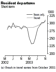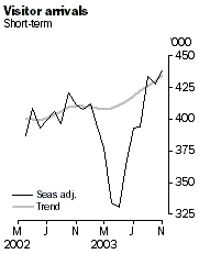 NOTES PRELIMINARY DATA Preliminary estimates of short-term visitor arrivals for December 2003 will be available on the ABS website https://www.abs.gov.au on 27 January 2004. These estimates can be accessed by going to the home page and selecting Main Features (located under Statistical Products and Services) and then 34. Migration. Select Short-term Visitor Arrivals to Australia, Preliminary (cat. no. 3401.0.55.001). December 2003 will be the final issue under this title. Estimates will continue to be electronically published under the new title, Short-term Visitor Arrival Estimates, Australia (cat. no. 3401.0.55.001)., effective from January 2004. DATA NOTES For data quality issues see appendix 2 of this publication. This publication contains movement data. Care should be taken when interpreting this movement data as 'people'. See paragraph 5 of the Explanatory Notes for more detail. Calculations of percentage and numeric change as shown in the Key Points and/or Main Features of this publication are based on unrounded data. See paragraph 11 of Explanatory Notes for more detail. INQUIRIES For further information about these and related statistics, contact the National Information and Referral Service on 1300 135 070 or Chrissy Beruldsen on Canberra (02) 6252 5640. MAIN FEATURES RECOVERY OF SHORT-TERM VISITOR ARRIVALS AND RESIDENT DEPARTURES FROM RECENT WORLD EVENTS In seasonally adjusted terms, short-term visitor arrivals and short-term resident departures recorded the highest number of movements to date in 2003 (439,300 and 312,100 movements respectively). November 2003 short-term movements continue to indicate a regained confidence in overseas travel to and from Australia, after the down-turn experienced during March and April 2003. This downturn can be largely attributed to the emergence of Severe Acute Respiratory Syndrome (SARS) (March 2003), the anticipation and commencement of military action in Iraq, and recent international terrorist fears. SHORT-TERM VISITOR ARRIVALS In original terms, November 2003 recorded the highest monthly number of short-term visitors to Australia to date in 2003 (473,300 movements). The top ten source countries for short-term visitor arrivals for November 2003 and the percentage and numeric change compared to November 2002 are presented in the table below.