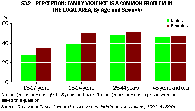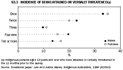 In 1994, 45% of Aboriginal and Torres Strait Islander people felt that family violence was a common problem in their area, 24% felt that it was not and 31% stated that they did not know. While similar proportions of males and females were unsure, a higher proportion of females (48%) than of males (42%) felt it to be a common problem in the local area. The highest proportion of people who perceived that family violence was a common problem in their area was among people 25-44 years of age. The teenagers 13-17 years old had the lowest level of perception of family violence (31%). The different perceptions of males and females was particularly marked in the 18-24 years age group: while 50% of 18-24 year old females felt family violence to be a common problem in the area, only 39% of males felt this way. Similar proportions of males and females in the older (25-44 and 45+ years) age groups considered that it was a common problem (see graph S3.2). Although substantial proportions of respondents from both the urban and rural areas saw family violence as a common problem locally, this perception was more widely held in the non-capital city urban areas (51% of respondents) and rural areas (49%) than in the capital cities (32%). Women in the non-capital urban areas were most likely to perceive family violence to be a problem (53%), whereas this was least likely among capital city males (28%). Experience of criminal victimisation Higher proportions of respondents in capital cities experienced this form of victimisation (17%) than people in other urban areas (12%) or rural areas (10%). Overall, a slightly higher proportion of Aboriginal and Torres Strait Islander males (14%) than females (12%) were attacked or verbally threatened. Males living in the capital cities experienced the highest incidence (19%), almost one in five. Of the Aboriginal and Torres Strait Islander people aged 13 years and above who were attacked or verbally threatened in the year prior to interview, 66% were attacked or threatened more than once. This compared with 44% of assault victims from the 1993 National Crime and Safety Survey. Overall the frequencies were broadly similar for males and females; 17% of females had been victims 10 or more times, compared with 14% of males (graph S3.3). About one-third (37%) of the last incidents of attack or verbal threat were reported to the police; 49% of the female victims, compared with 26% of the male victims, reported the last incident to the police. Experiences with the law A higher proportion of males were arrested more than once in the previous five years (19%) than were arrested just once (12%). Both the likelihood of arrest and the frequency of arrest were particularly high among males in the age groups 18-24 years and 25-44 years (47% and 38% respectively) compared with people in the other age groups. As with males, females aged 18-24 years had a relatively high level of arrests, with 8.4% arrested once over the five years and 7.7% more than once.