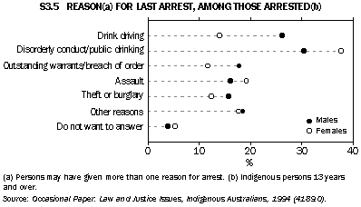 The respondents who had been arrested were asked to identify the reason for their last arrest. Some gave more than one reason. The reason most frequently reported was 'disorderly conduct/drinking in public' at 32%, followed by 'drink driving' offences at 23% (see graph S3.5). For both male and female Aboriginal and Torres Strait Islander people, disorderly conduct/drinking in public was the most common reason for the most recent arrest, (31% and 38%, respectively). The second most common reason for males was drink driving (26%); for females it was assault (19%). REFERENCES ABS publications National Aboriginal and Torres Strait Islander Survey, An Evaluation of the Survey, 1994 (4184.0). National Aboriginal and Torres Strait Islander Survey, Detailed findings, 1994 (4190.0). Occasional Paper, Law and Justice Issues, Indigenous Australians, 1994 (4189.0).