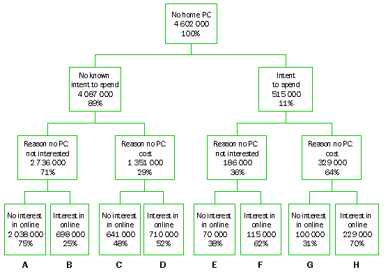 These stated reasons offer some clues into factors which would need to change for households to acquire either a computer or a modem. The BTCE's analysis of non-computer using households involves grouping together households for which there is a stated lack of interest, or perceived lack of use for a computer, or a lack of skills, and distinguishing this group from those which state that cost, or access elsewhere (e.g. in the workplace) is the reason for not having a home computer. This division is based on the following two assumptions. First, households for whom a lack of interest in, or perceived lack of use for, computers is the main barrier must be viewed as much less likely to purchase computers and/or modems even if costs fall. Second, households for whom cost is the main barrier to equipment acquisition may be assumed to be willing to purchase computers or modems in principle, but to be subject to a binding financial constraint. Such constraints are likely to weaken as the costs of computing equipment fall in real terms, standards become established and a greater emphasis on the residential market by suppliers makes purchasing easier (and less risky) for consumers. On the basis of these two assumptions, responses to the question about stated reasons for lack of past purchases are used in the analysis as an additional filter on the division of the non-digital population into those who intend to spend and those who do not. Interest in online services Information was also sought for the first time in the 1996 survey on interest in a range of online services. All households, irrespective of whether or not they used a computer, were asked whether they would consider using a television or computer for home-based shopping, banking, gambling and/or staying in touch with people or finding things out via electronic mail (e-mail). They were asked to ignore cost considerations for the purpose of the exercise. The ABS survey aimed to avoid associations with particular technology platforms by asking respondents to consider whether they would be interested in the services delivered by means of a television or computer. Tree analysis The various permutations of responses to the three questions referred to above can be examined systematically using tree analysis. In this analysis, the more important the attribute, the closer it is to the top of the diagram (see Aitkin 1982 for a discussion of an Australian application of this form of analysis, which is useful for depicting complex relationships between socio-demographic attributes which are themselves strongly co-correlated. See Sonquist, Baker and Morgan 1971 for the methodology.) Therefore, since intention to spend already has demonstrated predictive power, households were first divided using responses to this question as the first discriminant. The best ordering of the other two ABS questions - both of which were asked for the first time in 1996 - could not be determined without analysis to test the extent to which binary division of each group, using the response to a particular survey question, reduced variance in the sample. However, such statistical analysis is not readily carried out without access to data in electronic format. Therefore, reason for non-adoption was ranked as the second discriminant, on the basis that these responses are based on past, actual behaviour - in contrast to interest in online services, which is necessarily speculative about future interest in services which are likely to be unfamiliar to most households. The next section presents the results of the tree analysis and is followed by a description of how the results may be used to assess the likelihood of different groups of households acquiring computers in the short term. Results In diagram S3.2, a classification of non-computer using households is depicted, in which they are grouped on the basis of spending intentions, reason for not having a computer at home and interest in online services. At each branch of the tree, the number of households and the proportional split between the two branches at the same horizontal level is shown. Figure S3.2 shows how the 70% of households which the February/May data set indicates did not have a computer at home responded to the three ABS questions considered here. For example, working down the left hand side of the tree: