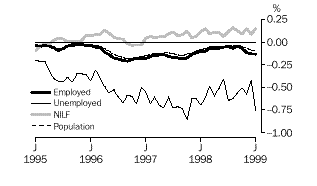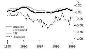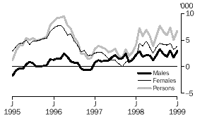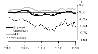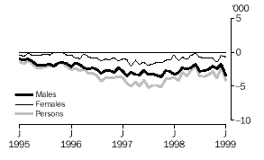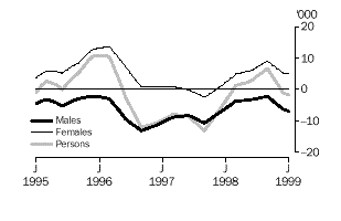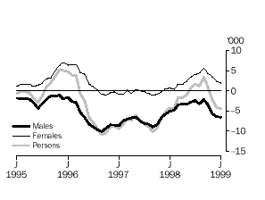 Estimates of employed males decreased for most of the revision period, with a maximum reduction of 10,100 in September 1996. In the final month of the revision, January 1999, the estimate decreased by 6,500. In contrast, changes in the estimates of employed females were positive at the beginning and end of the period. A maximum increase of 7,000 was recorded in December 1995 and an increase of 2,000 was recorded in January 1999. Throughout 1997 and 1998 revisions to estimates of employed females were close to zero.