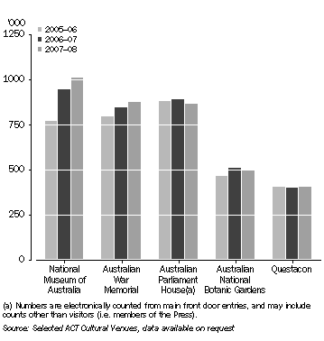 South Australia had the highest attendance rates for Libraries (40%) and Other performing arts (21%), while Western Australia had the highest attendance rate for Zoological parks and aquariums (43%). The ACT had the second highest attendance rates for Zoological parks and aquariums (41%) and Other performing arts (20%). The two most popular cultural venues for ACT residents were Cinemas (71%) and Museums (47%). For the rest of Australia, Cinemas were the most popular cultural venue. Overall, attendance rates for ACT females (92%) were higher than for ACT males (88%). ACT resident females account for higher attendance rates than ACT resident males in all cultural venues and events, except for Popular music concerts, where males had a higher attendance rate (37%) compared with females (32%). ATTENDANCE BY AGE GROUPS In the ACT, people aged 15-34 years were more likely to attend at least one cultural venue or event, with an attendance rate of 93%. Attendance rates decreased for older age groups with people aged 35-54 years recording an overall attendance rate of 91%, and people aged 55 years and over recording an attendance rate of 84%. ACT residents aged 15-34 years and 35-54 years had the highest attendance rate at Cinemas (83% and 72% respectively). Whereas ACT residents aged 55 years and over recorded an attendance rate at Cinemas of 53%, but had the highest attendance rates for Art galleries (42%), Museums (49%), Botanic gardens (55%), Classical music concerts (20%) and Theatre performances (28%). Those aged 35-54 years had the highest attendance rate for Libraries (37%), Dance performances (20%), Musicals and operas (23%) and Other performing arts (21%). ATTENDANCE BY EQUIVALENT GROSS HOUSEHOLD INCOME For the ACT, as equivalent gross household income increased, so too did attendance rates for each of the cultural venues and events in this survey. ACT residents who attended at least one venue or event with household income in the fourth and highest quintiles had an attendance rate of 97%, with those in the third quintile reporting 87% attendance, and those in the lowest and second quintiles reporting 76% attendance. FREQUENCY OF ATTENDANCE The cultural venues and events which were frequented four or more times by ACT usual residents and had the highest rates of attendance were Libraries (75%), Cinemas (68%), Popular music concerts (36%) and Art galleries (35%). ATTENDANCE BY COUNTRY OF BIRTH For the ACT, the attendance rate for people born in Australia who attended at least one venue or event was 92%. For those ACT residents born overseas in main English speaking countries who attended at least one venue or event it was 89%, and for those born in other countries it was 79%. ACT residents who were born in Australia had the highest attendance rate for Cinemas (76%), whereas those who were born overseas in main English speaking countries had the highest attendance rates for Botanic gardens (67%), Museums (62%), Art galleries (53%), Zoological parks and aquariums (50%), Libraries (41%) and Theatre performances (33%). ATTENDANCE BY SELECTED CULTURAL VENUE The ACT, as the nation's capital, attracts visitors to a number of its national institutions, not only from ACT usual residents, but from interstate visitors and international visitors. The venue with the highest number of visitors in the financial year 2007-08 was the National Museum of Australia with 1,007,856. This was an increase of 7% from the previous 12 months. The venue with the second highest number of visitors was the Australian War Memorial with 873,547, up by 3% from the previous 12 months. Between 2005-06 and 2007-08, attendance rates increased for the National Museum of Australia by 31% (237,255 visitors), Australian War Memorial by 10% (80,214 visitors), Australian National Botanic Gardens by 8% (36,609 visitors) and Questacon decreased by 0.4% (1,441 visitors). Of the five venues, Questacon is the only one to charge an admittance fee. Document Selection These documents will be presented in a new window.