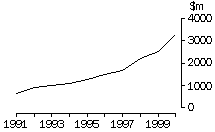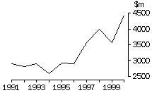 Passenger motor vehicles (SITC 781) has been the most significant import group, by value, since 1992. In 2000 it accounted for 6.7% of Australia's total imports, compared with 4.5% in 1991. Japan has remained Australia's major source of imported passenger motor vehicles over the decade, but its share of the market declined from 83% in 1991 to 60% in 2000. Germany and Korea increased their market shares over the decade. The increase in the value of imports of passenger motor vehicles can be attributed to a decrease in the number of domestically produced models, growth in demand for small vehicles, reduction in tariff rates for imported cars and greater competition in the passenger motor vehicle market. The slowdown in 1999 can be attributed to both the Asian economic crisis and an oversupply of foreign made passenger motor vehicles in Australia. Australia's imports of Motor vehicles for the transport of goods (SITC 782) have increased steadily over the decade, accounting for 1.7% of total imports in 1991 and 2.1% in 2000. Japan supplied 85% of these imports in 1991, but by 2000 this had decreased to 53%, with Germany and the USA increasing their market shares. Imports of Motor vehicle parts and accessories (SITC 784) similarly increased steadily over the decade. As a proportion of total trade, there was an increase from 1.7% in 1991 to 2.2% in 2000. Japan was again the main supplier contributing 51% in 1991 and 48% in 2000. AIRCRAFT Value The value of Aircraft and associated equipment (SITC 792) imports fluctuated over the decade, due to the irregular demand for and the high price of new aircraft. From 1998, there has been an increase in imports due mainly to new airlines entering the domestic market. It should be noted, that aircraft which are imported under an operational lease are not included in merchandise imports. NON-MONETARY GOLD Value The value of imports of Non-monetary gold (SITC 971) showed a significant peak in 1998 due to large imports of non-monetary gold from Asia for processing in Australia and subsequent export, one of the consequences of the Asian economic crisis. BALANCE OF TRADE The graph below shows Australia's total exports and imports over the decade, with the balance of trade (exports less imports) also included. Australia's exports increased by 106% and its imports increased by 135% over the decade. While there was a trade surplus at the beginning of the decade, for most of the decade Australia experienced a trade deficit. A weaker Australian dollar helped narrow this deficit in 2000. ABBREVIATIONS USED