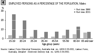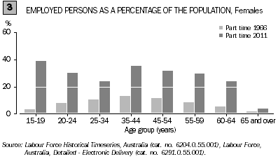 Having young children has a large influence on women's labour force participation. Nowadays many women reduce their working hours while their children are young, rather than leave the labour force altogether as was previously more often the case. In August 2011, the proportion of women working part-time in the 25 to 34 year age group (24%), although lower than women in the younger or older age groups, was still 2 times higher than it was in August 1966 (11%).