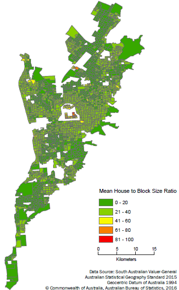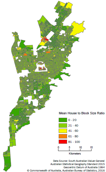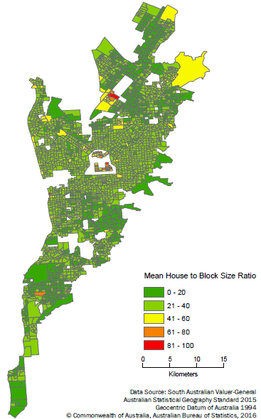 Figure 4 - Mean house to block size ratio, by SA1, Adelaide UCL, 2014
