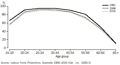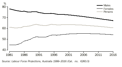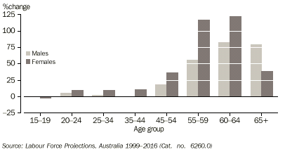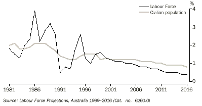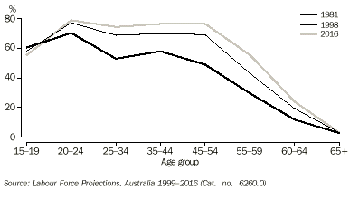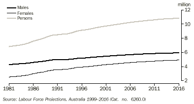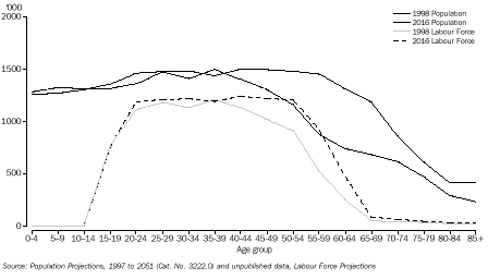 The technique aims to illustrate what future labour force outcomes might be realised if the assumed labour force and population trends eventuate. The results are neither predictions nor forecasts, as they merely extrapolate past trends, rather than assess possible future trends. DEMOGRAPHIC TRENDS Australia's population is ageing. One of the major causes of this is that people born in the baby boom (1947-61) will move into the older age groups (55 years and over). Due to the relatively low fertility of the 1970s, 80s and 90s there are relatively fewer people taking their place in younger age groups. In 1998, 21% of the population were aged 55 or over; by 2016, this is projected to increase to 29%. Increasing life expectancy will also contribute slightly to the ageing of the population. There are similar numbers of people entering the labour force compared to the recent past, and there are no demographic forces likely to change this in the next 2 decades. However, with the ageing of the 'baby boomers', there is likely to be significant growth in the number of people leaving the labour force. LABOUR FORCE AGEING With Australia's population ageing, the labour force will also age. More than 80% of the projected growth in the labour force between 1998 and 2016 will be in the 45 years and over age group. In 1998, 10% of the labour force were aged 55 and over, yet this age group is projected to account for nearly half of all the growth in the labour force. The 60-64 years age group will grow most rapidly, accounting for less than 3% of the labour force in 1998, but accounting for 15% of the total growth in the labour force between 1998 and 2016. AGE STRUCTURE OF THE POPULATION AND THE LABOUR FORCE - 1998 AND 2016 While those aged 20-44 years made up 62% of the labour force in 1998, they are projected to contribute only 20% of the growth in the labour force between 1998 and 2016. Males in this age group represented 35% of the labour force in 1998, but are projected to contribute only 3% of the growth in the labour force (an additional 44,400 males) between 1998 and 2016. By 2016, 15-19 year olds in the labour force are projected to have fallen by 1% (8,400 fewer than in 1998). LABOUR FORCE 1998-2016: PROJECTED GAINS GROWTH SLOWING The labour force is projected to grow, on average, by 0.8% per year over the period 1998 to 2016, compared with average annual growth of 1.9% for the period 1979 to 1998. In the first nine years of the projection period, the labour force is projected to grow by 1 million, while in the second nine years it is projected to increase by half a million. The projected annual growth rate falls over the projection period, from 1.6% in 1998-99 to 0.4% in 2015-2016. The growth rate at the end of the projection period is expected to be very low by historical standards, and falling. Despite this slower growth, over the period 1998 to 2016 the labour force could rise by 16% or 1.5 million, to 10.8 million. LABOUR FORCE AND POPULATION GROWTH: ANNUAL INCREASE The male labour force is projected to increase by 631,700 to 5.9 million, an average annual growth rate of 0.6% between 1998 and 2016. The female labour force is projected to increase by 867,600 to 4.9 million, an average annual growth rate of 1.1% between 1998 and 2016. Women are projected to contribute 58% of growth in the labour force to the end of the projection period, rising from 43% of the total labour force now to 45% by 2016. PARTICIPATION RATES The overall labour force participation rate is projected to fall to 60.6%. This rate was last experienced in 1984. In 1990, the labour force participation rate peaked at 63.7%-the highest level since it has been measured. It is not projected to reach this level again during the projection period. PARTICIPATION RATES ESTIMATES AND PROJECTIONS Historically, females in the main child-bearing years (25-34) have had lower participation rates than women aged 20-24 or 35-44. During the 1980s and 90s, there was a trend towards mothers returning to work sooner after the birth of their children. This trend is assumed to continue, thereby increasing the participation rates of women aged 25-34 to rates similar to those in the surrounding age groups. PARTICIPATION RATES - FEMALES Women's participation in the labour force is projected to rise in every age group except those aged 15 to 19 and those aged 65 and over. Participation by women in age groups between 25 and 54 is projected to increase by between 6 and 7 percentage points over the period 1998 to 2016. The participation rates of females aged 55-59 are projected to increase the most-by 12 percentage points. In contrast, labour force participation rates for men are projected to fall in every age group except for those aged 60 and over. The projected male participation rate is influenced heavily by the changing age structure of the population. The projected decline in the participation rate from 73% in 1998 to 67% in 2016 reflects the substantially higher proportion of the male population aged 65 and over, together with a substantial fall in the proportion of males aged 25-44 years. PARTICIPATION RATES - MALES Historically, male participation rates have displayed an inverted U shape, with participation rising steeply from age 15-24, remaining relatively stable from ages 25 to 54 and then declining sharply. This shape remains for the projection period. A LIKELY FUTURE? Changes in participation rates, and the components of population growth (birth and death rate and overseas migration levels) will have a relatively small impact on the future labour force. The bulk of the labour force in 2016 will be made up of people who are currently alive and in Australia. The size and age distribution of the current Australian population is the most important factor in determining the size and age distribution of the labour force in 2016. As the population ages, population growth will slow. While the likely slowing in labour force growth could be moderat