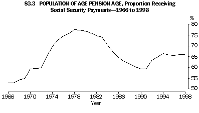 Graph S3.3 shows recipients of social security income support as a proportion of the pension age population from 1966 to 1998. Coverage of age pensions increased significantly in the 1970 to 1975 period, due to the phased abolition of the means test. Reductions in coverage were significant in the period 1980 to 1990, associated mainly with the reimposition of the income test on pensioners aged 70 years and over and the reintroduction of the assets test. Changes in the number of DVA pensioners have also affected numbers receiving the age pension. This is essentially a cohort effect, as the group of World War II veterans moved into retirement.