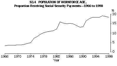 Graph S3.4 shows receipt of pensions and benefits among persons of workforce age2 from 1966 to 1998. The proportion of the population of workforce age receiving social security income support remained below 5% until 1974. In this period, the majority of male recipients were invalid pensioners, while women received invalid, wife or widow pensions.