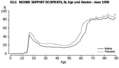 There are important differences in receipt of payments by gender, as shown in graph S3.6. Nearly 59% of current income support recipients are women. There are a number of reasons for this. Pension age is lower for women than for men, and there are more women than men over 65. Nearly 17% of men of pension age are receiving veterans' pensions, compared with only 6% of women. Finally, women are slightly more likely than men at all ages to be receiving income support, presumably because of lower income and assets.