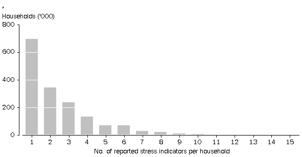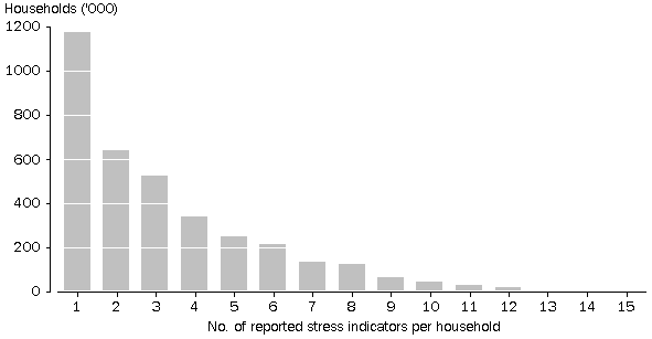 On balance, while some of the indicators (such as seeking assistance from welfare/community organisations) are more severe than others, it is difficult to rank or weight them in order to derive a single measure of intensity of reported financial stress. For this analysis, it was therefore decided to give them all equal weight together with the deprivation indicators, and to simply present the results according to the total number of indicators reported.