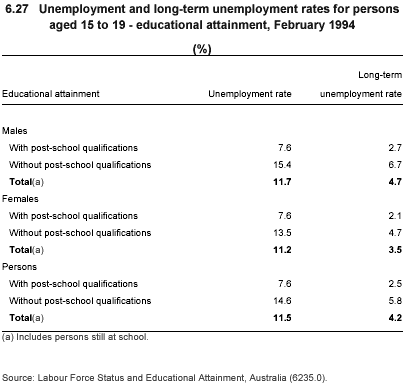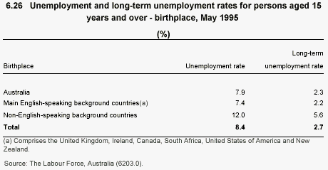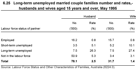 THE LONG-TERM UNEMPLOYED Of the long-term unemployed in May 1995, 67% were male, which exceeded their labour force share of 57.1%. Long-term unemployment rates for males were higher than for females across all age groups, except for those aged 15 to 19 years. While younger males had high long-term unemployment rates, the rates were highest for older males. More than half of unemployed males aged 45 years and over, were long-term unemployed. The average duration of unemployment (i.e. the average length of the current spell of unemployment for all unemployed persons within a particular group) tended to increase with age for both males and females. In May 1995, the average duration of unemployment for long-term unemployed males was shorter than for females across most age groups. However, the average duration of unemployment for all long-term unemployed males (142.5 weeks) was longer than that for all long-term unemployed females (133.4 weeks). This reflects the high concentration of long-term unemployed males in older age groups, which have relatively higher average duration of unemployment. Evidence suggests that there is a relationship between the unemployment and long-term unemployment experience of one family member and the labour market experience of other family members. In May 1995, of the 102,300 married couple families that had at least one partner long-term unemployed, only 31,900 (31.2%) had a partner in employment. Furthermore, there were 7,500 married couple families in which both partners were long-term unemployed. These married couple families tend to be more isolated from the work force and may have fewer informal contacts to assist in their search for employment. Sole parents also experience higher rates of long-term unemployment. In May 1995, the long-term unemployment rate for female sole parents (5.4%) was considerably higher than that for wives with dependants (1.5%). In addition, since the height of the 1990-91 recession, the long-term unemployment rate for female sole parents has fallen at a slower rate than that for wives with dependants. The birthplace of migrants is another factor which can influence a person's labour force experience. In May 1995, migrants from other than main English-speaking background countries experienced a higher long-term unemployment rate than either people born in Australia or migrants from main English-speaking background countries. For migrants from non-English speaking backgrounds, long-term unemployment rates decreased as their length of residence increased. Those who had recently arrived in Australia experienced a long-term unemployment rate of 10.7% in May 1995. This compares to 3.7% for migrants who arrived prior to 1971. In February 1994, long-term unemployment rates were significantly higher among people without post-school qualifications. Those who had not completed the highest level of secondary school had the highest long-term unemployment rate (6.8%). Over the last decade, the proportion of the long-term unemployed with post-school qualifications increased from 21.1% to 27.6%. This increase coincided with an increase in the proportion of the labour force with post-school qualifications. However, the increase in the proportion of long-term unemployed people with post-school qualifications has been much greater, primarily since the onset of the 1990-91 recession. There is significant variation in the long-term unemployment rates between the various States and Regions in Australia. In May 1995, Tasmania (3.6%), South Australia (3.5%) and Victoria (3.3%), had the highest long-term unemployment rates, well above the national average of 2.7%. For Tasmania and Victoria, these high long-term unemployment rates were reflected in Hobart (3.6%) and Melbourne (3.3%), as well as throughout the remainder of these States. While Adelaide had a long-term unemployment rate of 3.9%, the rest of South Australia experienced a rate less than the national average. The highest regional long-term unemployment rates were experienced in the western suburbs of Sydney and Melbourne, as well as along the coastal areas of south-east Queensland and southern New South Wales. A more detailed analysis of long-term unemployment can be found in Australia's Long-term Unemployed: A Statistical Profile (6255.0). Document Selection These documents will be presented in a new window.