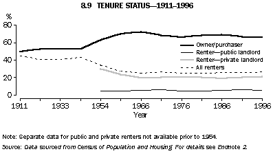 CHANGING TENURE STATUS HOME OWNERSHIP INCENTIVE SCHEMES Early Commonwealth government schemes, such as those developed in the 1920s to encourage home ownership, fell on hard times. This can be attributed to several factors such as constitutional difficulties and the economic effects of the Great Depression and World War II. As a result, home ownership levels increased only slightly over that period, reaching 53% by 1947. Following the creation of the Commonwealth Housing Commission (CHC) in 1944 and the first of many Commonwealth State Housing Agreements (CSHAs) in 1945, policies encouraging home ownership have been given high priority. Home ownership has been promoted through the provision of grants or guaranteed loans to building societies and banks to finance construction of owner occupied homes and to provide increases in the amount of finance available for housing purposes. In addition, both Commonwealth and State Governments have, at various times, provided direct incentives and grants to home buyers. Examples of these include low interest loans, grants to first home buyers and low deposit 'start-up' schemes. All of this meant that, by the early 1970s, Australia had the second highest rate of home ownership in the developed world, coming second to only to Iceland.1 When the Capital Gains Tax was introduced in the 1980s, exemptions were made for the profits made from the sale of the family home. Since peak levels in the mid 1960s, there has been a slight decline in the proportion of households owning or purchasing their own home. There are a number of possible explanations. Social changes, such as people marrying later and delaying to have children, may cause subsequent delays in the timing of decisions to purchase a home. In addition, labour market reforms, which have resulted in a more mobile labour force and reduced certainty of employment, may have impacted on people's housing decisions. Also, the high interest rates of the 1980s made housing less affordable, while in the 1990s, rates of appreciation (price increase) of dwellings slowed in many areas and were even negative in some regions. As a result, it is possible that owner occupation was less likely to be viewed as the 'good investment' it once was, with some people opting to rent rather than buy a home and to seek alternative investments. PUBLIC (RENTAL) HOUSING The provision of low cost, subsidised public housing was recognised early as an essential complement to home ownership incentives and schemes. After some earlier, tentative starts in Victoria and New South Wales, the large scale provision of public rental housing for both moderate and low income earners got underway after World War II. Since the mid 1940s, the Commonwealth Government has facilitated, through successive CSHAs, the growth (in numbers) of subsidised rental housing-usually through the provision of loans to participating States, with low interest rates and long repayment periods. Continuing into the mid 1990s, the emphasis has largely been on retaining public housing levels. For example, as stock was upgraded and sold off, earnings were usually pooled back into the purchase of replacement stock. Through measures such as these, the proportion of public housing stock has remained remarkably constant, at around 5%, since the mid 1960s. Indications are, however, that absolute numbers are now starting to decline. As with directions in other areas of public infrastructure, Commonwaelth and State Governments are moving to reduce their levels of investment in public housing. PRIVATE RENTAL ASSISTANCE SCHEMES Since the late 1970s, the Commonwealth Government has broadened its involvement in private rental assistance programs, progressively widening the range of persons eligible for assistance through such schemes. It has also increased the amount of assistance available to individuals and families. (For more information on the private rental assistance scheme, see the section Housing assistance.) Investment in the private rental market has also been encouraged, largely through the provision of tax breaks such as depreciation and negative gearing of rental properties. ENDNOTES 1 Housing Australia: A Statistical Overview, 1992 (1320.0). 2 In addition to unpublished data from the Census of Population and Housing for 1971, 1976, 1981, 1986, 1991 and 1996, data for the graph and text in this article were drawn from a range of publications relating to Censuses between 1911 and 1996. Document Selection These documents will be presented in a new window.