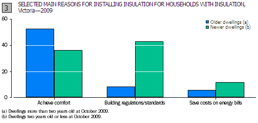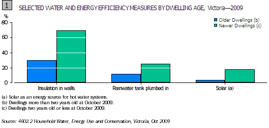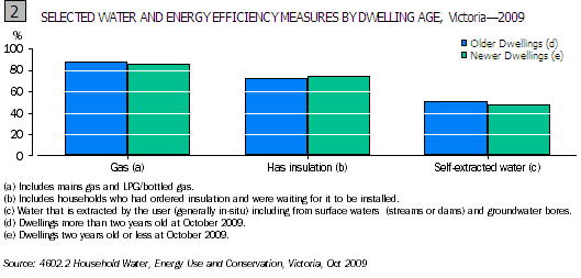 As households in newer dwellings were more likely than households in older dwellings to be renting or residing in semi-detached dwellings and apartments, this may have impacted the results when looking at water and energy sources and use by dwelling age. Overall, rented dwellings and semi-detached dwellings and apartments were less likely to have a rain water tank and insulation, two areas where households in newer dwellings had higher proportions than households in older dwellings. Due to high relative standard error, it was not possible to explore these relationships further. ENERGY AND WATER EFFICIENCY ELEMENTS OF NEWER DWELLINGS A greater proportion of households in newer dwellings had solar hot water systems, rainwater tanks plumbed into the dwelling and walls insulation than older dwellings. Households in newer dwellings were more likely than households in older dwellings to have their rainwater tank plumbed into the dwelling. 25% of households in newer dwellings had a rainwater tank plumbed into their dwelling whereas 12% of households in older dwellings had the same. However, households in newer and older dwellings showed no statistically significant difference for having a rainwater tank overall (37% and 29% respectively). Households in newer dwellings were more likely than older dwellings to have solar as a source of energy for heating water. 18% of households in newer dwellings had solar energy, compared with 3.8% of households in older dwellings. Regulations state that all new Victorian dwellings cannot be approved without either a solar hot water system or a rainwater tank, which has been in effect since 2005. ABS estimates (above) were from a sample survey asking respondents whether or not the dwelling they resided in had these items. Statistics from 2008 new domestic building permits indicated higher rates of both solar hot water systems (28%) and rainwater tanks (47%), but at a similar ratio to ABS estimates (Building Commission 2009) (End Note 1) . Households in newer dwellings with insulation (including households who had ordered but not yet installed insulation) were more likely to have insulated walls (69%) than households in older dwellings (30%) (End Note 2) . In nearly all cases this was as well as having insulation in the roof or ceiling. However, overall, households in older and newer dwellings which had insulation made up similar proportions. DIFFERENCES AND SIMILARITIES IN ENERGY AND WATER SAVING ELEMENTS OF OLDER AND NEWER DWELLINGS Households in older and newer dwellings showed similar rates of having alternative sources to mains water. 51% and 48% respectively had self-extracted water (water that is extracted by the user (generally in-situ) including from surface waters (streams or dams) and groundwater bores). Of the two main types of alterative water sources, households in older dwellings were more likely to have grey water (31%) than households in newer dwellings (22%) but both had about a third with rainwater. For energy sources, households in older and newer dwellings had similar rates of gas as an energy source (including mains gas and LPG or bottled gas). Households in older dwellings had 88% and households in newer dwellings had 86% with gas. Households in older and newer dwellings had similar rates of insulation overall, with 72% of households in older dwellings and 75% of households in newer dwellings having insulation installed or ordered. Households in older and newer dwellings were equally likely to have roof or ceiling insulation (99%) (End Note 2) . Households in older and newer dwellings differed in their reasons for installing insulation. Households in older dwellings were more likely than households in newer dwellings to state the main reason for installing insulation as to achieve comfort (52% and 36% respectively). Households in newer dwellings were more likely to state their main reason for installing insulation as building regulations and standards (43%) than households in older dwellings (8.5%). Households in newer dwellings also had a higher proportion who stated their main reason for installing insulation was to save on the costs of energy bills (12%) compared to households in older dwellings (5.8%). Households in older and newer dwellings both showed rates of over 95% for households with a washing machine and refrigerator. They also had similar rates for clothes dryers and separate freezers, but households in newer dwellings were more likely to have a dishwasher (69%) than households in older dwellings (52%). 75% of households in older and newer dwellings had an air conditioner and used it for similar amounts during the summer months. Almost all of households in older and newer dwellings had televisions. A higher proportion of households in older dwellings had a cathode ray television (CRT) (analog) (74%) than households in newer dwellings (53%) whereas a higher proportion of households in newer dwellings had LCD and plasma televisions (50% and 36% respectively) than households in older dwellings (36% and 23% respectively). CONCLUSION Households in newer dwellings had higher rates of insulation installed in the walls, solar energy for the hot water systems and rainwater tanks plumbed into dwellings than households in older dwellings. However, households in older dwellings and newer dwellings show similar proportions of self-extracted water, mains gas, insulation overall, household white goods and appliances and air conditioner ownership and use. Households in newer dwellings were more likely to have the water and energy efficiency elements they needed to reach government building standards but beyond these measures they were quite similar to households in older dwellings. END NOTES 1 Building commission data classified new domestic buildings as including all new building work for domestic use, including dwellings, where regulations make environmentally sustainable building inclusion mandatory, but also includes fences, swimming pool