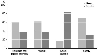 SEX AND AGE OF VICTIM In Queensland in 2007, more males than females were victims of robbery (70% of victims were male), assault (62%) and homicide and related offences (61%). For sexual assault, more females (83%) were victims than males. PERSON VICTIMS, Selected offences by sex, Queensland, 2007 Four out of every ten (40%) victims of homicide and related offences were aged 25-44 years and persons aged under ten contributed a further 17%. The 25-34 years age group had the highest proportion of victims of assault (25% of male victims and 23% of female victims of assault were aged 25-34 years). Of the 721 male victims of sexual assault, around one-third (240 males) were aged under ten. For female victims of sexual assault, the age groups with the highest proportions of victims were 10-14 years and 15-19 years each with 28%. Over one-quarter (26%) of the 1,367 person victims of robbery were aged 15-19 years. LOCATION OF OFFENCE3 In Queensland in 2007, residential locations were the most likely place of occurrence for homicide and related offences. Seventy per cent of attempted murders and 60% of murders occurred in a residential location. Assault victims were most likely to be subjected to this offence in either a community location (39% of assault victims) or a residential location (38%). Over two-thirds (68%) of sexual assault offences occurred in a residential location. The majority of victims of kidnapping/abduction were taken from a community location (61%) and a further 25% were taken from a residential location. Nearly one-half (48%) of robbery offences occurred in a community location. Of the robbery offences occurring in a community location (840), 86% occurred on a street/footpath. The majority of offences of unlawful entry with intent occurred in a residential location (61%). Other locations (13%) and retail locations (13%) were also significant contributors. The theft of a motor vehicle was most likely to occur in either a residential location (40%) or a community location (38%). Nearly one-third (32%) of other theft offences occurred at a retail location. VICTIMS, Selected Offences occurring by selected locations, Queensland, 2007 WEAPON USE In Queensland in 2007, a weapon was used in 71% of murders, 70% of attempted murders, 42% of robberies and 19% of assaults. A knife was the most common type of weapon in committing these offences. Nearly one-half (46%) of attempted murder victims, 31% of murder victims, 20% of robbery victims and 4.7% of assault victims were subjected to an offence using a knife. A firearm was involved in 17% of murder offences and 5.9% of robbery offences. Of the 19,298 assault offences a bat/bar/club was used on 550 occasions and a bottle/glass on 322 occasions. In the committing of sexual assaults, 98% of these offences did not involve a weapon. VICTIMS, Weapon used in commission of offence, Queensland, 2007 OUTCOME OF INVESTIGATION In Queensland in 2007, 86% of the police investigations into homicide and related offences and 58% for assault were finalised within 30 days of the recording of the incident by police. The lowest proportions of finalisations at 30 days were for victims of unlawful entry with intent (14%), other theft (22%) and motor vehicle theft (23%). VICTIMS, Outcome of investigation at 30 days, Queensland, 2007 Of the 110 murder investigations finalised, 97% had an offender proceeded against. Unlawful entry with intent (96%) and other theft (91%) also had high proportions of finalised investigations where the offender was proceeded against. Sexual assault (69%) and blackmail/extortion (79%) had the lowest proportions of finalised investigations where the offender was proceeded against. FURTHER INFORMATION Further information on this topic can be accessed in Recorded Crime - Victims, Australia, 2007 (cat. no. 4510.0). In addition to recorded crime statistics, the ABS collects information in household surveys from members of the public on their experiences of crime. Information for assault and sexual assault, as well as data for a range of other offences, are available from the 2005 ABS National Crime and Safety Survey (NCSS) and the 2005 ABS Personal Safety Survey (PSS). The NCSS measured people's perceptions of crime in the community and whether or not the crimes were reported to police. Detailed information about the survey results can be found in Crime and Safety, Australia, Apr 2005 (cat. no. 4509.0). The PSS measured people's experience of violence, harassment or stalking. Detailed information about the survey results can be found in Personal Safety Survey, Australia, 2005 (cat. no. 4906.0). The next NCSS will be conducted in 2008 for the 2008-09 reference period. Caution should be exercised in making any direct comparisons between recorded crime statistics and data from ABS household surveys due to the different scope and coverage, methods of measurement and sources of error. END NOTES 1. The definition of a victim varies according to the offence category: