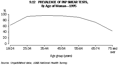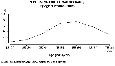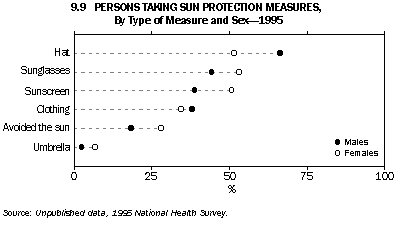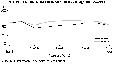 DETECTION OF SKIN, BREAST AND CERVICAL CANCERS Sun protection measures taken The 1995 National Health Survey found that, in the month prior to interview, 82% of people took measures to protect themselves from the sun, 15% did not take measures and 3% were not exposed to the sun. In most age groups, males were more likely than females not to take sun protection measures. The highest proportions of people who did not protect themselves from the sun were among males aged 55-64 years and 65-74 years (19% of both groups). The most common type of sun protection was wearing a hat (59% of people). Sunglasses (49%), sunscreen (45%) and clothing for the purpose of sun protection (36%) were also commonly used. More than 23% of people said that they avoided the sun in the month prior to the survey. For males, the most frequent sun protection measure was wearing a hat; for females it was sunglasses (graph 9.9). Males were more likely than females to choose a hat or clothing for the purpose of sun protection. Females were more likely to either avoid the sun or to select sunglasses, sunscreen or an umbrella to protect themselves from the sun. Breast cancer and cervical cancer Responses to the Women's Health Questionnaire, part of the 1995 National Health Survey, revealed information about the steps taken by women to detect breast and cervical cancers. The information below about breast examinations, mammograms and pap smear tests is based on responses from the 72.3% of eligible women, aged 18 years and over, who provided a completed women's health questionnaire as part of the survey. Breast examinations In 1995, 67% of women regularly examined their own breasts for unusual lumps. Approximately 72% of women had had a breast examination performed by a doctor or medical assistant at some stage in their lives, but only 42% of women had regular breast examinations performed by these health professionals. In all age groups, regular breast self examinations were reported more frequently than were regular breast examinations performed by a doctor or medical assistant. Proportional differences between those who self examined and those who were examined by a health professional were greatest among those in the youngest age group (18-24 years), and in the oldest age group (75 years and over) (graph 9.10). Differences were smallest in those aged 45-54 and 55-64 years, due to an increase in the percentages of women in these age groups who had regular breast examinations by a health professional. Mammograms Overall, 36% of women had had a mammogram. Women aged 45-54 years (68%), and 55-64 years (74%) were the most likely to have had this test (graph 9.11). The most frequent reason given for a woman's last mammogram was a general check-up (54% of those who had had a mammogram), followed by the presence of symptoms (28%) and a family history of breast cancer (9%). Pap smear tests In 1995, most women (95%) had heard of a Pap smear test. Older women were least likely to have heard of this test, with 22% of women aged 75 years and over reporting that they had not heard of it. Overall, 84% of women had had a Pap smear test. Women in age groups between 25 and 64 years were those most likely to have had this test (graph 9.12). When asked about their last Pap smear test, 39% of women said that it was performed less than one year ago. A further 23% had a test from one to less than two years ago. Impact of usual language spoken at home Although data on fluency in English are not available from the 1995 National Health Survey, data are available on whether a person usually spoke English at home, to help assess the proposition that those who do not speak fluent English may be disadvantaged in obtaining information and education about health related matters including breast examinations, mammograms and Pap smear tests. In 1995, women who did not usually speak English at home were less likely than those who did to either examine their own breasts regularly (49% and 68% respectively) or to have had a breast examination performed by a doctor or a medical assistant (55% and 73%). Although women who did not speak English at home were less likely than others to have heard of a mammogram (62% compared with 89%), they were only slightly less likely to have had one (34% compared with 36%). Women who usually spoke a language other than English at home were less likely to have heard of a Pap smear test (77%) than were women who usually spoke English at home (97%). They were also less likely to have had a Pap smear test (61% compared with 86%). MORTALITY Deaths due to skin cancer In 1997, skin cancer was identified as the underlying cause of death for 810 males and 430 females, accounting for 4.2% of male deaths and 2.9% of female deaths from all types of cancer, and 1.2% of male deaths and 0.7% of female deaths overall. The total of 1,240 deaths due to skin cancer equates to a rate of 6.7 deaths per 100,000 population. Deaths due to breast cancer In 1997, breast cancer was identified as the underlying cause of death for 2,602 women aged 18 years and over, accounting for 17.4% of cancer deaths, and 4.3% of all deaths, of women in this age group. The adult female death rate for breast cancer was 37.1 deaths per 100,000 women aged 18 years and over. Deaths due to cervical cancer In 1997, cervical cancer was the underlying cause of death for 298 women. Cervical cancer accounted for 2.0% of cancer deaths and 0.5% of all deaths of women aged 18 years and over. The equivalent death rate was 4.2 deaths per 100,000 women aged 18 years and over. Document Selection These documents will be presented in a new window.