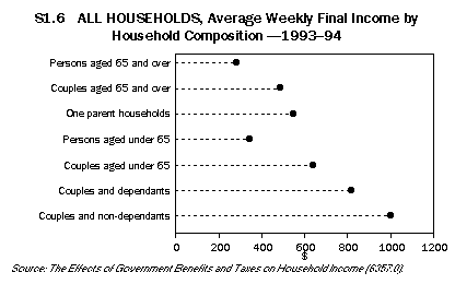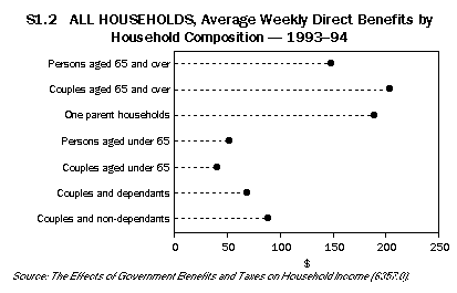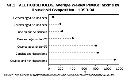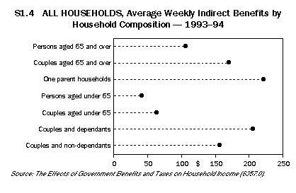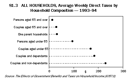 This article discusses the effects of selected government benefits and taxes on different households classified by household types and by income quintile groups. It then explores the extent of income inequality before and after government benefits and taxes, and how this has changed since 1984. Redistribution between income types, 1993-94 This section discusses the effects of selected government benefits and taxes on seven broad household types in 1993-94. It should be noted that household size and composition strongly affected the level of household income from employment and from other sources, including government direct and indirect benefits. The discussion begins with a description of income prior to government intervention, which is followed by a discussion of the government benefits and taxes incident on the different household types. Finally it describes the overall effect of government benefits and taxes on the distribution of income between the seven household types. Private income Private income includes income from employment, self-employment, investments, superannuation, child support and other regular income excluding government cash pensions and allowances. In 1993-94, private income was predominantly income from employment and self-employment, and there was a close relationship between the number of household members who were employed and the level of household private income. People aged 65 years and over living in a couple or living on their own were rarely employed and, as shown in graph S1.1, had the lowest private incomes ($186 and $65 respectively) of all the seven household types. Persons aged under 65 living alone and one parent households, which typically had only one or no person employed, had relatively lower weekly private incomes ($392 and $216 respectively) than the next three groups. Couples with dependants and couples under 65 years living on their own were more likely to have one or both partners employed and had weekly private incomes of $807 and $780 respectively. Couples living with non-dependants, which usually included two or three employed persons, had the highest weekly private incomes ($1,089) of the seven household types. Direct benefits Direct benefits are government cash benefits and allowances such as the age pension, sole parent pension and unemployment allowances. Gross income is the sum of private income and direct benefits. As shown in graph S1.2, couples over 65 years received the highest amounts of weekly direct benefits ($204), the major components of which were age pension and Veterans' Affairs pensions. People over 65 who were living on their own received similar direct benefits but at slightly lower levels because they were eligible for single rather than married pensions. One parent households with dependants received the next highest amounts of weekly direct benefits ($190); these benefits consisted mostly of sole parent pension and family payment. Couples under 65 received the lowest amounts of weekly direct benefits ($41). Direct taxes Direct taxes refer to personal income taxes and the Medicare levy. As shown in graph S1.3, couples with non-dependants, couples with dependants and couples under 65 years paid the highest amounts of weekly direct tax ($230, $185 and $170 respectively). This reflects the higher levels of gross income received by these households. Couples with non-dependants paid 20% of their gross income in taxes, while couples with dependants and couples under 65 paid 21%. People aged 65 years and over, living on their own or as a couple, paid the lowest weekly direct taxes ($14 and $31 respectively), reflecting their low levels of gross income and their eligibility for pensioner rebates. This represented 6% and 8% of their gross income. Indirect benefits Indirect benefits are non cash benefits received by households from health, education, housing and other social security and welfare services such as child care assistance. Figure S1.4 shows that households with children received the highest levels of indirect benefits. One parent households received slightly higher weekly indirect benefits ($221) than couples with dependent children ($207). For both household types, the main benefits were education benefits (most of which were school benefits). Although one parent households usually contained fewer children than couple households with dependants, the children were more likely to attend public schools than private schools, so that the overall indirect benefits they received were slightly higher. Indirect benefits were also high for people over 65 living as a couple or on their own. Couples received $171 per week and lone persons received $107 per week. Most of these benefits were in the form of health services (mainly hospital benefits). People under 65 living alone or as couples were less likely to use educational or health services and received the least in indirect benefits ($42 and $64 respectively). Indirect taxes Indirect taxes are taxes paid on goods and services purchased by households. On average, households with higher incomes spent more and hence paid more indirect taxes. Figure S1.5 shows that couples with non-dependants had the highest gross weekly incomes ($1,178) and paid the highest weekly indirect taxes ($96). People over 65 living alone had the lowest gross incomes ($213) and paid the least indirect tax ($15). Final income Final income is private income adjusted for the taxes and benefits covered by the study. As shown in figure S1.6, the distribution of final incomes was more equal than of private incomes (see figure S1.1). Households with high private incomes, such as couples with non-dependants and couples with dependants, had final incomes of about the same level. The highest average final weekly income of the seven household types was $1,009 for couples living with non-dependants, which was lower than their average weekly private income of $1,089. The lowest average weekly final income was $