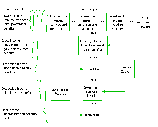 When indirect benefits and taxes are taken into account (final income), the percentage change in the Gini coefficient over the decade is equal to 3%. This indicates that government indirect benefits and indirect taxes decreased income inequality and had a greater redistributive effect in 1993-94 than in 1984. More detailed estimates indicate that indirect benefits are responsible for the further increase in equality. Overall, these results provide a broad indication of changes in income distribution. They indicate that government benefits are having a greater redistributive effect than in previous years but that this has not completely compensated for the increasing inequality of private incomes. However, the results of this study should be treated with caution. The study does not take into account many of the changes occurring over the decade, such as the decrease in average household size, the increase in the number of two income families and changes in other household characteristics. Additionally, the estimated values for the indirect benefits and taxes reflect the study methodology. Although the methodology is similar to those used in other studies in Australia and overseas, there are other approaches which could have been taken and might have produced different results. Appendix - Income concepts and definitions The starting point of the study was the adjustment of private income. Private income is the total current weekly income of all members of the household including income from employment, self-employment, superannuation, investments and other non-government sources before the deduction of taxes and excluding any government benefits. Government direct benefits to persons, such as pensions and unemployment benefits, were added to private income to obtain gross income. Direct taxes were deducted from gross income to obtain disposable income. Government indirect benefits for housing, education, health and social security and welfare were added to give disposable income plus indirect benefits. Finally, indirect taxes were deducted from disposable income plus indirect benefits to produce final income. The derivations for the successive income concepts are illustrated in figure S1.10. The taxes and benefits used in the adjustment of income were as follows: