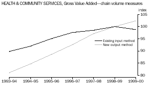 For the health and community services and education industries, the new method will be used to backcast estimates to September quarter 1993. Most of the changes to the other industries can only be introduced from September quarter 1999. Prior to those periods, the existing series will be spliced onto the new. Changes will flow through to the full suite of national accounts releases, including State and Territory accounts where relevant. This article describes the reasons for the changes, details the new methods and compares the new and existing industry estimates for health and community services, and education services. Overall, these changes are expected to have a positive impact on chain volume GDP growth rates. For 1999-2000 it is estimated that the impact will be to raise GDP growth by 0.3 percentage points. BACKGROUND TO THE CHANGES Historically, the measurement of service industry volumes has presented national accountants both here and abroad with a number of difficulties. Many services are heterogeneous in nature and it is difficult to observe the underlying quantum of service provided or received. Moreover, some services are predominantly provided by non-market producers-they are provided by government or non-profit institutions free of charge or at prices significantly below costs, so sales or price information are non-existent. More often than not, growth in input volumes have tended to be used as a proxy for growth in volumes of service industry output and value added. Hours worked or costs deflated by wage and other input price indexes have been primary components of these input-based methods. The main disadvantage of using input methods is that they do not reflect changes in output resulting from increased productivity. For this reason, a number of services industries have been excluded from the scope of ABS productivity statistics. There have been a number of initiatives underway in recent years to improve the availability and quality of services industry data, some of which have already been introduced in the national accounts. The present round of improvements stem from the following:
