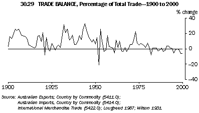 In 1900 Australia exported goods valued at £40m and imported goods valued at £38m; the trade surplus, although small, was significant for the period. A century later Australia exported goods valued at $97,255m and imported goods valued at $110,083m, a trade deficit of $12,828m. Graph 30.29 shows the balance of trade as a percentage of total trade (i.e. imports plus exports) over the 20th century. On average there has been a surplus of approximately 7% of total trade over the century. The largest percentage surplus (31%) occurred in 1931-32, shortly after the Wall Street crash in 1929 and the onset of the Great Depression. Trade surpluses continued in every year of the 1930s. Australia's largest trade surplus (in percentage terms) occurred in 1942-43, during the Second World War, at 33% of total trade. Two further years of large surpluses, 25% and 16%, occurred in 1943-44 and 1944-45. International trade in these years was, of course, at a low level because of dangers to shipping. Australia's greatest period of trade volatility occurred in 1951-52 and 1952-53, when the balance of trade changed from a deficit of 21% to a surplus of 26% of total trade, the latter in the year in which wool achieved the all-time record price of 'a pound a pound'. The longest period of trade stability has occurred since 1982-83. Over this period the balance of trade (surplus or deficit) has not exceeded 7% of total trade, and has tended to be a deficit in most years. AUSTRALIA'S TRADING PARTNERS In 1900 the United Kingdom was Australia's primary trading partner. Total trade with the UK was over five times greater than the total trade with Australia's second largest trading partner, the United States of America. With the exception of the USA, the other major trading partners were either European countries or members of the British Empire, reflecting Australia's close historical association with the UK in its developing trading relationships. By 1999-2000, the balance of Australia's trading relationships had changed significantly. Our trade focus is now firmly on the members of the Asia Pacific Economic Cooperation forum (APEC). Nine of Australia's ten major trading partners are members of APEC; the UK now ranks sixth. The USA is currently Australia's major source of imports. As graph 30.30 shows, through the century the share of Australia's total imports coming from the USA trended upwards until 1930s, and then fell back in the last years of World War II. There was strong growth in the US share of Australian imports during the 1950s and 1960s; since then the US share has remained roughly stable. The share of Australia's total imports coming from the UK declined steadily to the end of the 1940s, and then recovered some lost ground until the mid 1950s. The UK share fell away sharply during the 1960s and 1970s (graph 30.30). The share of Australia's total imports coming from New Zealand has remained steady through most of the century, but has been rising slowly since the 1970s. The Australia-New Zealand Closer Economic Relations Trade Agreement (CER) came into effect on 1 January 1983, providing each country with easier access to the other's markets. The share of Australia's total imports coming from Japan rose rapidly from the early 1960s until the mid 1980s, but has declined slowly since. The share of Australia's total exports going to the USA rose significantly through the mid 1930s, reaching a peak in the mid 1940s (graph 30.31). From the 1950s the US share of Australian exports was fairly steady in trend terms, but has fallen in recent years. At the turn of the century, the UK was by far Australia's major export destination, receiving nearly 60% by value of total Australian exports, rising to 70% during the 1930s. It fell sharply during World War II, recovering somewhat in the post-war years and in the 1950s. It has trended down since then. The share of Australia's total exports going to NZ has been increasing slightly over the century. In 2000 Japan is Australia's major export destination. The share of Australia's total exports going to Japan grew strongly from the 1950s, peaked in the early 1980s, and has been declining slowly since. MODES OF TRANSPORT Sea freight In 1904, it is recorded that 1,873 vessels carried 3.4 million net tons of goods from Australian ports. Of those vessels, 48% were steam ships, the remainder sailing ships. The majority of ships entering Australian ports were registered in the UK (42%) and Australia (19%). In 1924-25, 1,723 vessels departed Australian ports carrying 5.6 million net tons of goods. Of these vessels, 97% were steam ships. Again UK registered ships made up the majority of vessels clearing Australian ports (23%). By 1949-50, the 1,965 vessels that departed Australian ports carried 8.7 million net tons of goods. UK registered ships still comprised the greatest share (53%) of vessels entering Australian ports, but there were also ships registered in Norway, New Zealand and the United States. In 1974-75, 6,254 vessels departed Australia carrying 80.3 million net tonnes of goods. The largest proportion (21%) of vessels were Japanese. Significant proportions of UK, Liberian and Greek registered ships also entered Australian ports. In 1999-2000, total exports by sea freight weighed 463 million tonnes. The majority of vessels were registered in Panama (24%) and Japan. Other significant sources of registration included Liberia, Hong Kong, Taiwan and Singapore. The majority of vessels were destined for Japan. Air freight In 1949-50 a small volume (and proportion) of overseas exports and imports was moved by air. Official statistics record four aviation companies involved in overseas freight in this early period: British Commonwealth Pacific Airlines, Qantas Empire Airways Ltd., British Overseas Airways Corporation and Tasman Empire Airways Ltd. Common destinations included the South Pacific islands, Vancouver, Tokyo, Hong Kong and London. In that year, 797 tons were flown out