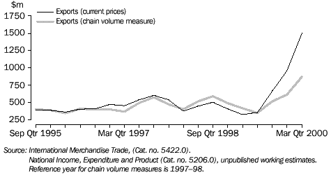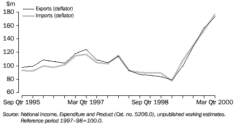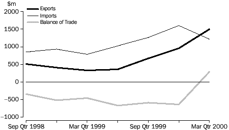 In recent quarters there has been strong growth in the value of both exports and imports of crude petroleum. Over the four quarters to March quarter 2000, the value of exports of crude petroleum totalled $3,491 million, 118% higher than the 1998-99 total. In the same period, the value of imports of crude petroleum totalled $5,106 million, 42% higher than the 1998–99 total. The value of imports fell in the March quarter 2000, but remained at an historically high level. In the March quarter 2000, the balance of Australia's merchandise trade in crude petroleum became positive for the first time in its recent history. Increases in the international oil price are the main determinant for the trends observed. Other factors include the commencement of production from significant new fields, some switching by Australian refineries to source crude petroleum from domestic production rather than imports, and the fall in the exchange rate for the Australian dollar against other currencies. GRAPH 2: QUARTERLY VALUE OF EXPORTS AND IMPORTS OF CRUDE PETROLEUM TABLE 2: QUARTERLY VALUE OF EXPORTS AND IMPORTS OF CRUDE PETROLEUM