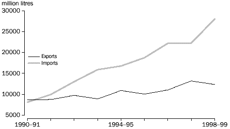 VOLUME OF EXPORTS AND IMPORTS The unit of quantity used to record trade in crude petroleum is litres. Between 1990–91 and 1998–99 the volume of exports of crude petroleum increased by 3,649 million litres (42%). Import volumes grew much more strongly over the same period, rising by 19,894 million litres (245%). In 1990–91, Australia exported more crude petroleum (8,734 million litres) than it imported (8,132 million litres). Since that time, the volume of imports on a financial year basis has exceeded that of exports, with the gap generally growing over time. GRAPH 3: ANNUAL VOLUME OF EXPORTS AND IMPORTS OF CRUDE PETROLEUM