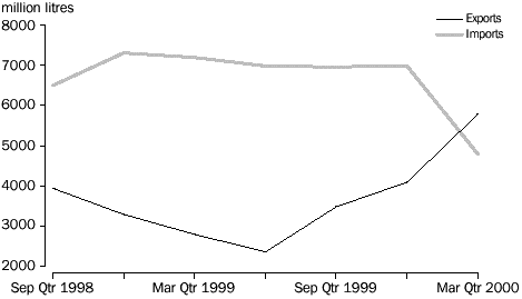 The volume of exports of crude petroleum decreased steadily during the first half of 1999, before registering strong growth. The March quarter 2000 volume was 5,809 million litres, the highest quarterly figure on record. After being steady for several quarters, the volume of imports of crude petroleum decreased in the March quarter 2000 to 4,792 million litres. This was the lowest quarterly figure since September quarter 1996. GRAPH 4: QUARTERLY VOLUME OF EXPORTS AND IMPORTS OF CRUDE PETROLEUM TABLE 4: QUARTERLY VOLUME OF EXPORTS AND IMPORTS OF CRUDE PETROLEUM