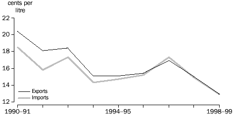 AVERAGE UNIT VALUES FOR EXPORTS AND IMPORTS Information on the prices paid and received for exports and imports of crude petroleum is not included on Customs records. However, by dividing the value of exports and imports by the respective trade volumes, a rough price measure (average unit value) can be derived. Use of average unit values calculated in this manner is often subject to a number of serious limitations as a measure of price change over time. Users who are interested in price movements in export and import commodities should refer to Export Price Index, Australia (Cat. no. 6405.0) or Import Price Index, Australia (Cat. no. 6414.0). These indexes are currently being reviewed and an Information Paper on the review was issued in November 1999 — Information Paper: Review of the Import Price Index and Export Price Index, 1999 (Cat. no. 6424.0). In paragraphs 7.13 to 7.15 of the Information Paper the possible uses and limitations of average unit values are discussed. Paragraph 16.13 of the System of National Accounts, 1993 (SNA93) makes similar comments. Average unit values suffer from limitations as price estimators for commodities that are not homogeneous and are likely to be affected by changes over time in compositional mix or quality. For basic commodities in the mining and agricultural sectors, these limitations are generally considered to be less severe. The average unit values (cents per litre) for exports and imports of crude petroleum decreased over the period 1990–91 to 1998–99, by 37% and 30% respectively. These movements largely reflect changes in international oil prices over this period. GRAPH 5: ANNUAL AVERAGE UNIT VALUES OF EXPORTS AND IMPORTS OF CRUDE PETROLEUM TABLE 5: ANNUAL AVERAGE UNIT VALUES OF EXPORTS AND IMPORTS OF CRUDE PETROLEUM