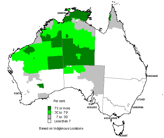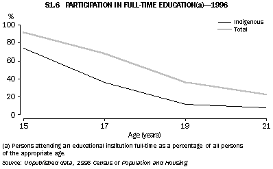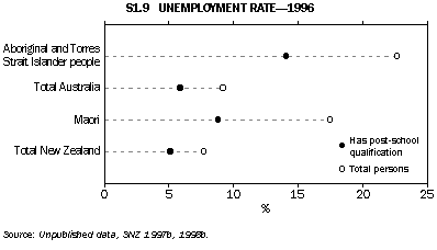 An urban population The Australian Indigenous population is becoming increasingly urbanised. 'Urban' is defined as a population centre of 1,000 or more people. At the 1991 Census, 67.6% of Indigenous people lived in urban areas; by the time of the 1996 Census this had increased to 72.6% (graph S1.4). In comparison, 85.1% of the total population lived in urban areas in 1991, increasing marginally to 85.9% in 1996 (ABS 1998c). By contrast, New Zealand Maori are more urbanised than Australia's Indigenous people, with 83.1% living in urban areas in both 1991 and 1996; this is very close to the proportion of the total New Zealand population residing in urban areas in both years (85.0%) (SNZ 1997b, 1997d). The urbanisation of Indigenous Australians does not reflect a mass movement to cities and towns by Indigenous people. Since the urban and rural classification is population based, some of the increase is a result of changes in classification of some smaller urban centres. Some of the increase is also a function of changes in the willingness of Indigenous Australians to identify themselves as such on the census form. This effect is more common in urban areas than in rural areas. There are differences in the types of urban centres in which Indigenous and other Australians reside. In 1996, Aboriginal and Torres Strait Islander Australians were less likely than the general population to be living in major urban areas of 100,000 or more people (30.3% of Indigenous people compared to 62.7% of the total population). On the other hand 42.3% of Indigenous people lived in smaller centres of between 1,000 and 99,999 people; in contrast, only 23.2% of the total population lived in smaller urban centres (ABS 1998c). Person characteristics Language The Australian Census asks each person which language he or she speaks at home. In 1996, 13.3% of Australian Indigenous people reported speaking an Indigenous language at home (ABS 1998c). In contrast, the New Zealand Census asks in which languages a person can carry on a conversation about everyday things. Of New Zealand Maori, 24.7% reported being able to carry on a conversation in the Maori language (SNZ 1997b). The Canadian Census, on the other hand, asks both language spoken at home and ability to carry on a conversation. A similar proportion of Aboriginal Canadians spoke an Aboriginal language at home as Indigenous Australians (15.0% and 13.3% respectively); at the same time a similar proportion of Aboriginal Canadians could carry on a conversation in an Aboriginal language as New Zealand Maori (29.3% and 24.7% respectively) (Statistics Canada 1998). In all three countries, indigenous language use was highest among older indigenous people and those living outside urban areas (ABS 1998c, SNZ 1997b, Statistics Canada 1998). In Australia, most Indigenous language speakers were concentrated in the north and west (map S1.5). Some areas where there were high numbers of not stated responses showed very low proportions of Indigenous language speakers. S1.5 INDIGENOUS LANGUAGE SPEAKERS, Proportion of Indigenous Population Source: 1996 Census of Population and Housing. Education Indigenous Australians were less likely to be attending an educational institution full-time than other Australians. In 1996, 73.7% of Indigenous 15 year olds were in full-time education compared to 91.5% of all 15 year olds (graph S1.6). At older ages the disparity between Indigenous and total persons increased, so that at age 19, when tertiary education could be expected to occur, only 12.0% of Indigenous persons were in full-time education, one-third the rate for total persons. The proportions of Aboriginal and Torres Strait Islander people and New Zealand Maori with a post-school qualification were very similar in 1996 at 13.6% and 14.3% respectively (graph S1.7). In contrast, 34.4% of the total population of Australia and 32.2% of the total New Zealand population had a post-school qualification (ABS 1998c, SNZ 1997b, 1997c). Indigenous people in major urban centres of 100,000 people or more were more likely to have a qualification than those in other areas (ABS 1998c). Labour force At the time of the 1996 Census, 52.7% of Australia's Indigenous population aged 15 years and over were in the labour force, in comparison to 61.9% of the total population of the same age group (table S1.8). Of the Indigenous labour force participants, 22.7% were unemployed, more than double the unemployment rate for the total population (9.2%). Thus, proportionally fewer Indigenous Australians were active in the labour force (that is, working or looking for work) and, of those in the labour force, proportionally fewer had a job. By contrast, there was virtually no difference in the proportions of both New Zealand Maori (65.3%) and the total New Zealand population (65.4%) in the labour force. The unemployment rate for Maori (17.5%), while lower than that for Indigenous Australians, was still more than double the rate for the total New Zealand population.