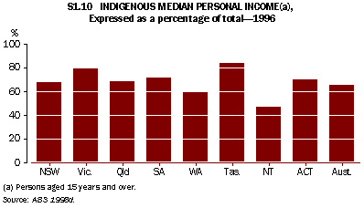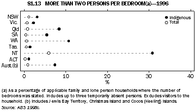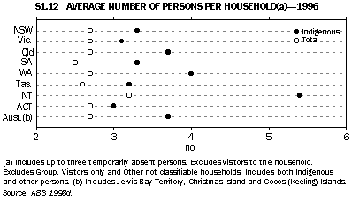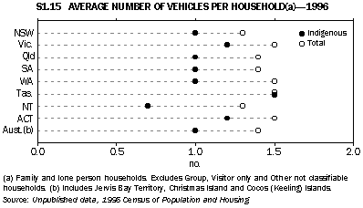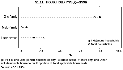 Overall, 56.6% of employed Indigenous people were employed full-time, lower than the rate for the total population of 67.8%. In contrast, there was virtually no difference in the proportion of Maori (75.9%) and the total New Zealand population (76.8%) who were employed full-time. Having a post-school qualification lowered the unemployment rate for all groups. The unemployment rate for Indigenous Australians with a post-school qualification was 14.1%, in comparison to 5.9% for the equivalent group in the total population (graph S1.9). For Maori with a post-school qualification, the unemployment rate, at 8.8%, was half that for all Maori. Income The median personal income of Indigenous Australians was $190 per week in 1996. This was 65.1% of the median income of all Australians ($292) (ABS 1998d) (graph S1.10). In contrast, New Zealand Maori had a median personal income which was 82.4% of that for all New Zealanders in 1996 (SNZ 1997b, 1997c). Indigenous people in Tasmania and Victoria came closest to income parity with all Australians, receiving 84.0% and 80.0%, respectively, of the median income of total persons in each State. At the other extreme, Indigenous people in the Northern Territory had a median income only 47.2% of that for the total population in that Territory. Households and housing A household is defined in the census as a group of people who usually reside and eat together. Households are further classified into family and non-family households, the latter defined as either groups of unrelated individuals or people living alone. An Indigenous household is defined as a family household where the reference person or spouse is Indigenous or a lone person household where the lone person is Indigenous. The concept of Indigenous household does not apply to group households. There were 94,931 Indigenous family and lone person households in 1996. Of these, 55.9% comprised only Indigenous people, with the remainder a mix of Indigenous and non-Indigenous people (ABS 1998c). Type of household A greater proportion of Indigenous households (86.6%) than of total households (76.2%) were family households (graph S1.11). Indigenous households were also more likely to be multi-family households than were total households. In 1996, 6.2% of Indigenous family households contained two or more families, while the corresponding figure for all households was only 1.2%. Nearly half (45.0%) of all three-family households were Indigenous households. Irrespective of the number of families in a household, Indigenous households had more residents on average than other households. Overall, there were 3.7 persons per Indigenous household, one person more than in all households (graph S1.12). On average, Indigenous households in the Northern Territory had the most persons per household at 5.4. Indigenous households in the ACT and Victoria were closest in size to total households with 3.0 and 3.1 persons per household on average. The additional residents in Indigenous households are partly explained by the number of children resident in family households. Of those Indigenous family households with children aged under 15, 15.2% had 4 or more children while only 5.1% of total family households had the same number of children (ABS 1998c). People per bedroom Given the larger size of Indigenous households, it is probable that housing stress would affect more Indigenous households than other households. Of Indigenous households, where the number of bedrooms was stated, 7.5% had more than two persons to each bedroom compared to 1.0% of total family and lone person households (graph S1.13). Although proportionally more Indigenous than other households had more than two persons per bedroom in every State and Territory, the extent of this varied widely across States and Territories. More than two people per bedroom were most common in the Northern Territory for both Indigenous and total households, accounting for 30.9% of Indigenous households and 6.0% of total households. Western Australia (10.8%) and Queensland (8.5%) had the next highest proportions among Indigenous households. Tenure The rate of home ownership among Indigenous households was much lower than for all family and lone person households. The homes of only 30.8% of Indigenous households were either fully owned or being purchased; the corresponding figure for all households was 70.0% (ABS 1998c). Of the 63.8% of Indigenous households who were renting their homes, nearly identical proportions were renting from private landlords and real estate agents (36.9%) and Government agencies (36.5%). In contrast, 65.5% of total renting households were renting from private landlords and real estate agents. Community and co-operative housing organisations were landlords for 15.7% of renting Indigenous households; by comparison only 1.9% of all renting households were renting from this type of landlord. Community and co-operative housing organisations were landlords to renting Indigenous households most often in rural areas (ABS 1998c). Household income Although there was, on average, one more person in Indigenous households (3.7) than in all households (2.7), median household income was $540 per week, $90 less than in all households (graph S1.14). Median household income varied across States and Territories. Although Indigenous households in the Northern Territory contained 5.4 people on average, two more than total households, median income for Indigenous households was over $200 less than for total households. While median household income is relatively higher for Indigenous households in the Northern Territory than elsewhere, this is accounted for by the fact that Indigenous households in the NT were the largest of any State or Territory. The size of Indigenous households was smallest in the ACT, but median household income was highest. Number of vehicles Access to services such as schools, hospitals, legal services and government agencies is a complex issue invo