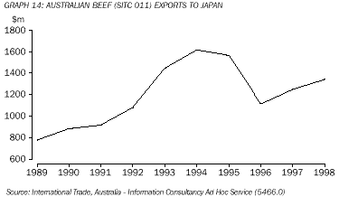 The main item exported under SITC 3 is coal (SITC 321). In 1998 exports of coal were valued at $4 billion, representing 24% of Australia's total exports to Japan in that year. Japan is Australia's most important coal export destination, accounting for 42% of Australia's world wide coal exports in 1998, down from 55% in 1989. Australia's coal exports to Japan rose from 1989 to 1993 but fell 15% in 1994 due to falling demand and consequent falling contract prices. From 1995 onwards, base contract prices rose resulting in a recovery in the value of Australian coal exports to Japan2 (see Graph 8). It should be noted that some coal exports were subject to confidentiality restrictions during 1995, so the graph understates the value of coal exports to Japan in that year. Australia remained Japan's largest source of coal imports in volume terms over the 10 year period; imports from Australia accounted for 56% of Japan's total coal imports in 1998, up from 52% in 19893. Since exports of liquefied natural gas (SITC 343) from the North West Shelf began in 1989, gas has also been a substantial export to Japan within the mineral fuels and lubricants group. Between 1989 and 1994, exports of natural gas increased 813% – from $112 million to $1,023 million (see Graph 9). By 1994, Japan was by far our most important market with natural gas exports representing 6% of our total exports to Japan. Since August 1995, Australia's gas exports have been subject to confidentiality restrictions and are now included in SITC 98 – combined confidential items of trade. Another important export to Japan within SITC 3 is crude petroleum oil (SITC 333) with exports rising more than twenty fold from $35 million in 1989 to $715 million in 1992 (representing 5% of Australia's total exports to Japan). From 1993 onwards, export values declined due to falling world prices and declining Japanese demand. By 1998 crude petroleum exports were down to $336 million, representing only 2% of our total exports to Japan. Japan's importance as a destination for our crude petroleum exports has varied over the decade – in 1989 it was the destination for 5% of our crude petroleum exports; this grew to 40% in 1992 and then fell to 19% by 1998. The second major category of Australian exports to Japan is commodities classified as crude materials (SITC 2). Some confidential commodities (principally nickel mattes and mineral sands) which would otherwise be classified to SITC 2, are included in commodities and transactions not classified elsewhere (SITC 9). The most important components of crude material exports to Japan are iron ore (SITC 281) and copper ore (SITC 283), which together accounted for 12% of Australia's total exports to Japan in 1998. Exports of iron ore to Japan grew from $1,122 million in 1989 to $1,789 million in 1998 (see Graph 11). Exports of copper ores also increased over the 10 year period, from $142 million in 1989 to $381 million in 1998. Japan is Australia's principal market for both iron and copper ores. Australian exports of iron ore to Japan accounted for 45% of our world wide exports of these goods in 1998 – down from 54% in 1989, while exports of copper ore to Japan accounted for 39% of our world wide copper ore exports – down from 81% in 1989. Fluctuations in the value of iron ore exports to Japan over the 10 year period (see Graph 11) were caused by changing contract prices, reflecting changes in overall global supply and demand and increasing competition for market share, particularly from Brazil. However, Australia remained Japan's largest import source, accounting in volume terms for 51% of its world wide iron ore imports in 1998 – up from 44% in 19893. Between 1989 and 1998, Australian exports of wool (SITC 268) to Japan declined dramatically in value. In 1989, exports of Australian wool to Japan were worth $1,004 million and accounted for 8% of our total exports to Japan and 20% of our world wide exports of wool. By 1998, Australian exports of wool to Japan were worth just $193 million, a decline of 81% over the ten year period (see Graph 12). Australian wool exports to Japan in 1998 represented only 1% of our total exports to Japan and just 7% of our world wide wool exports. The fall in the value of wool exports to Japan was caused by a combination of factors including, high stocks of semi-processed wool, substitution of cotton and synthetic fibres for wool, falling world export prices and a decline in Australian wool production due to a drought in 19952 Despite the sharp fall in the value of wool exports over the 10 year period, Australia remained Japan's largest import source, in volume terms accounting for 79% of Japan's total wool imports in 1997-984 . Over the period 1989 to 1998, Japan has consistently taken virtually all of Australia's exports of woodchips (SITC 246). In 1998, exports of woodchips to Japan were worth $609 million – up 61% on the 1989 figure of $378 million. In 1998, woodchip exports to Japan represented 3% of our total exports to Japan and 97% of our global woodchip exports. Food and live animals (SITC 0) was the third largest group of commodities exported to Japan. The major export within this group is beef, fresh, chilled or frozen (SITC 011). Australia's beef exports to Japan almost doubled, from $773 million in 1989 to $1,341 million in 1998. In 1989 Japan's share of Australia's beef exports was 37%. Between 1992 and 1995, however, Japan's market share rose steeply and from 1993 onwards, Japan overtook the United States of America as Australia's largest export destination, taking 47% of Australia's beef exports in 1998 (see Graph 13). The sharp rise in beef exports to Japan up until 1994 reflected the combined effect of increasing consumer demand, gradual tariff reductions and the continued strength of the yen. The downturn in exports in 1995 and 1996 was due, in large measure, to an appreciating Australian dollar and growing competition from the United States of Ame
