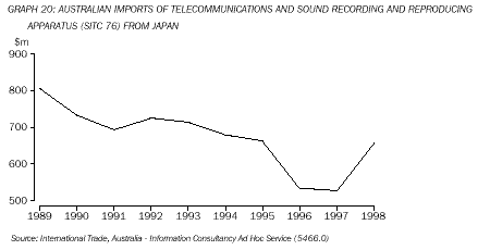 Japan is still Australia's most important trading partner although over the past 10 years its relative significance, both as an export destination and as a source of Australian imports, has declined. In each of the years from 1989 to 1998, Japan was Australia's largest trading partner. The value of Australia's total trade (exports plus imports) with Japan increased by 34% – from $23 billion in 1989 to nearly $31 billion in 1998. Japan's share of Australia's total trade, however, has decreased significantly – from 23% in 1989 to 17% in 1998. While Australia's total exports increased by 89% over the period, our exports to Japan increased by only 40%. Similarly, while our total imports increased by 87%, our imports from Japan increased by only 27%. In each of the last 10 years, Japan was Australia's most important export destination and the second largest import supplier, after the United States of America. In 1998 Japan was the destination for 20% of our exports and supplied 14% of our imports (see Graphs 2 and 3). From Japan's perspective, Australia is significantly less important as a trading partner for both merchandise exports and merchandise imports. In the year ending June 1998, Australia was the destination for only 2% of Japan's exports and the source of 4% of Japan's imports – a small decrease over the corresponding percentages for 1989 of 3% and 5% respectively1. AUSTRALIA'S BALANCE OF TRADE WITH JAPAN Australia has recorded merchandise trade surpluses with Japan in each of the last 10 years. The surplus with Japan grew from $2 billion in 1989 to $6 billion in 1991 before declining to just under $4 billion in 1993. From 1994, the surplus steadily increased once again, exceeding $5 billion in 1997 before falling back 24% to a $4 billion surplus in 1998, due largely to increasing imports of passenger motor vehicles from Japan. As a proportion of the value of total merchandise trade (exports plus imports) between Australia and Japan, the trade surplus with Japan increased from 8% in 1989 to peak at almost 26% in 1991. The surplus subsequently showed a steady decline to a little under 14% in 1993 and 1994, before steadily increasing once again to 21% in 1996. By 1998, however, the surplus had fallen to just 13% (see Graph 5). The continuing trade surplus with Japan contrasts with Australia's persistent trade deficit with the rest of the world which grew 79% from a little under $7 billion in 1989 to $12 billion in 1998. Continuing trade deficits with the United States of America and the European Union have been only partly offset by surpluses with Japan as well as with the Republic of Korea (see Graph 6). 1999 UPDATE In the March quarter 1999, Australia's merchandise trade surplus with Japan was $600 million, a significant decline from the surplus of $1,155 million recorded for the corresponding quarter in 1998. The fall in the surplus since the December quarter 1998 is a result of a significant decline in Australia's total merchandise exports to Japan (mainly wool and coal). Between the March quarters 1998 and 1999, exports to Japan declined 8% – from $4,206 million to $3,879 million, while imports from Japan increased by 7% – from $3,052 million to $3,279 million (see Graph 7). More details on the latest 3 months trading with Japan can be obtained by contacting any of the ABS offices shown on the back of this publication. COMMODITY ANALYSIS OF TRADE WITH JAPAN Tables D and E show Australia's trade flows with Japan for the two years 1989 and 1998 for major selected commodities, the share of total trade with Japan represented by each commodity in 1989 and 1998, and the proportion of Australia's world wide trade in each of the major commodities traded with Japan. Some of the data in Tables D and E are affected by confidentiality restrictions. In making comparisons at the commodity level it should be noted that, in Australia's international trade statistics, confidential commodity data are not reported against the commodity, but rather are classified to SITC 98 – combined confidential items of trade. While confidentiality restrictions do not affect total import and export statistics, they do affect data comparability at the commodity level. In particular, it should be noted that Australia's export commodity statistics with Japan are significantly affected by confidentiality restrictions. EXPORTS Over the 10 years to 1998, Australia exported mainly primary products to Japan. Mineral fuels and lubricants (SITC 3) was the largest group of commodities by value exported from Australia to Japan from 1989 to 1998, accounting for nearly a third of Australia's exports to Japan over the decade. In 1998, exports of mineral fuels and lubricants accounted for $5 billion (28%) of Australia's total exports to Japan – up 56% on the $3 billion (25%) in 1989, but down on the 35% share achieved in the early 1990's.
