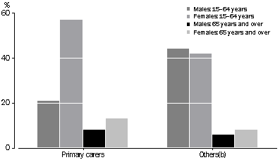 MAIN RECIPIENTS OF CARE LIVING ELSEWHERE In situations where the main recipient of care was not living with the primary caregiver, 82% of caregivers were women, with the majority (80%) of main care recipients aged 65 and over (see table below). Most primary carers not living with the main recipient of care were caring for a parent (63%), while a further 32% were caring for someone other than a partner or child. (See Disability, Ageing and Carers, Australia: Summary of Findings, 1998 (Cat. no. 4430.0); p47). PRIMARY CARERS(a), AGE GROUP BY AGE GROUP OF MAIN RECIPIENT OF CARE