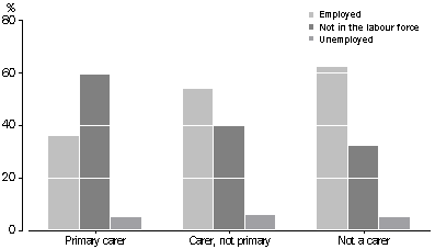 EMPLOYMENT In 1998 the proportion of primary carers who were neither working nor looking for work was almost double that of those who were not in the caring role (59% compared with 32%). This lower rate of labour force participation is also reflected in the relative employment rates for primary carers (36%) and those that were not caring for anyone (62%).