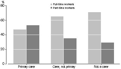 Does the performance of a primary carer role have an effect on a person's participation in the work force, regardless of age or gender? Primary carers are a little more likely to be aged 65 years or more than others (22% compared with 14%), and the majority of primary carers are women. However, age and sex alone do not explain the lower employment rate for primary carers. Assuming that all primary carers in paid work were in the 15 to 64 year age group (as virtually all were), 46% were employed. This is lower than the employment rate for all women aged 15 to 64 (61%). It would appear that the primary caring role does reduce a person's chances of being employed. (See Disability, Ageing and Carers, Australia: Summary of Findings, 1998 (Cat. no. 4430.0); p35, p43, p45, p46). The employment patterns of primary carers are very similar to those of women in general. Of those who were employed, just over half (53%) of primary carers were in part-time work compared with 49% of all women and 29% of those not performing a caring role. (See Disability, Ageing and Carers, Australia: Summary of Findings, 1998 (Cat. no. 4430.0); p35, p45).