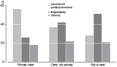 INCOME The limited employment opportunities for primary carers are also reflected in their relative incomes, with a majority (56%) reporting a pension or allowance as their principal source of income.
