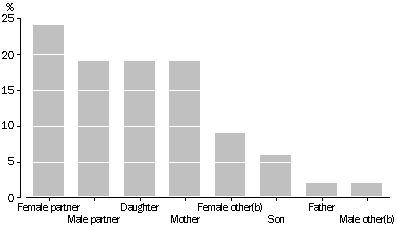 RELATIONSHIPS OF CARE The primary caring role was most often performed by partners (female 24% and male 19%), daughters (19%) or mothers (19%) of the main recipient of care.