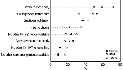 WHY PEOPLE PROVIDE CARE People take on the caring role and provide assistance to people in need for different reasons, and in some instances, for a number of reasons. The most commonly reported reason for taking on the primary caring role by children (72%) and parents (59%) was 'family responsibility'. A high proportion of both partners and parents also felt that they could provide better care (53% and 49%) than would otherwise be available. While many carers for parents felt an emotional obligation towards caring (43%), many also felt that there were no other family or friends available (30%) or willing (19%) to take on the role of primary carer.