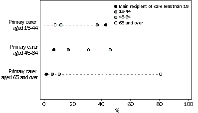Most primary carers aged 65 and over (81%) were caring for people in their own age group. These carers were most often partners of the care recipients. Among primary carers aged 15-44, 43% were caring for children under 15, and another 37% for people in the same age group. The demands on primary carers in the middle age group, 45-64, were more varied with 46% caring for recipients of the same age, 31% caring for recipients aged 65 years and over and 17% caring for someone aged between 15 and 44 years.